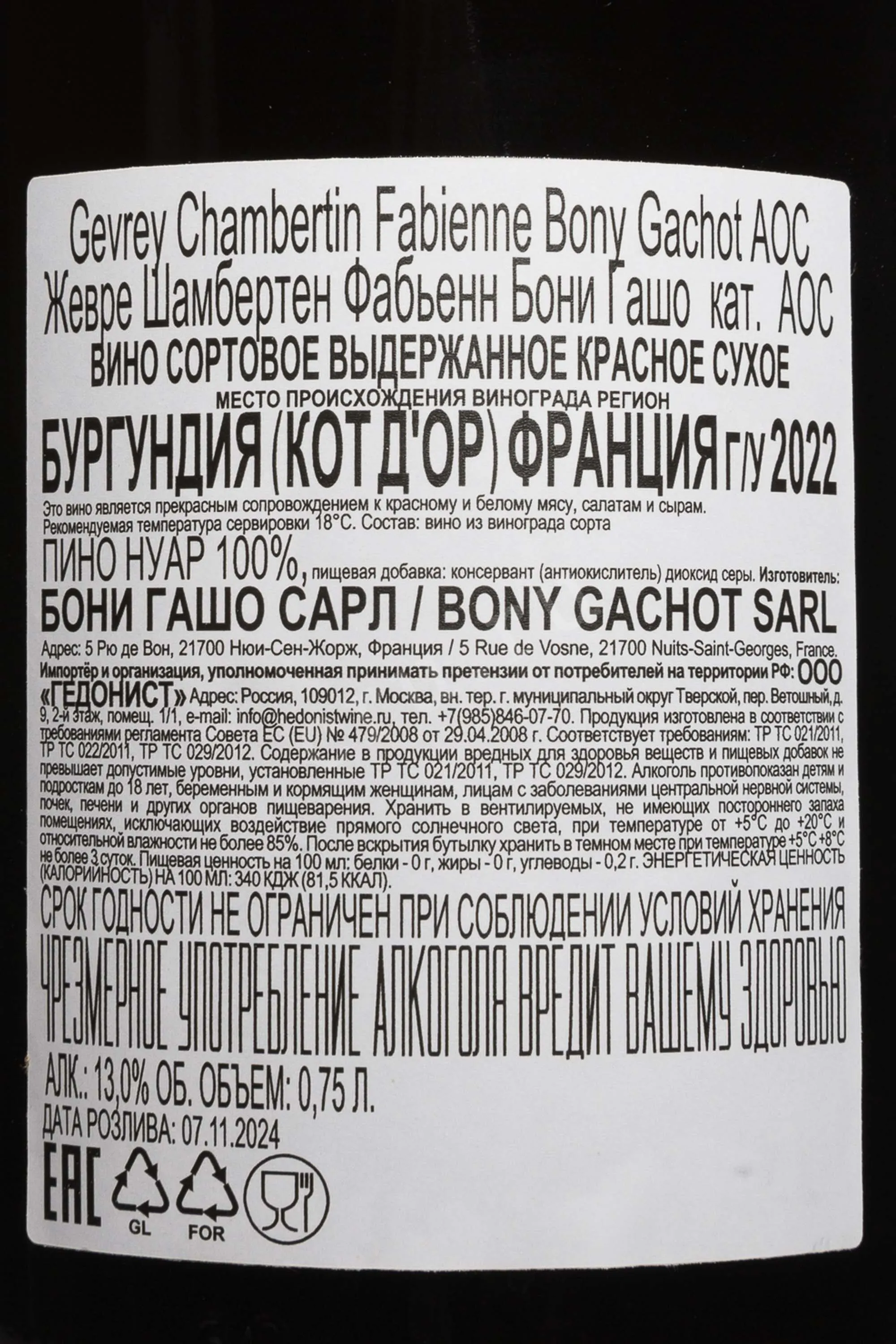 Красное сухое вино Domaine Bony Gachot Gevrey-Chambertin AOC 2022 г. 0,75 л передаёт характер северной части Кот-де-Нюи, где виноград созревает на склонах с известняками и плотной глиной. Участки хозяйства дают ягодам хорошую концентрацию и устойчивую кислотность благодаря прохладному климату и умеренному солнечному освещению. Урожай собирают вручную. После сортировки сырьё сбраживали в небольших стальных ёмкостях, а отжатое сусло — выдерживали во французском дубе как минимум полтора года. Винификация проходила без излишнего вмешательства, чтобы сохранить природное выражение терруара.