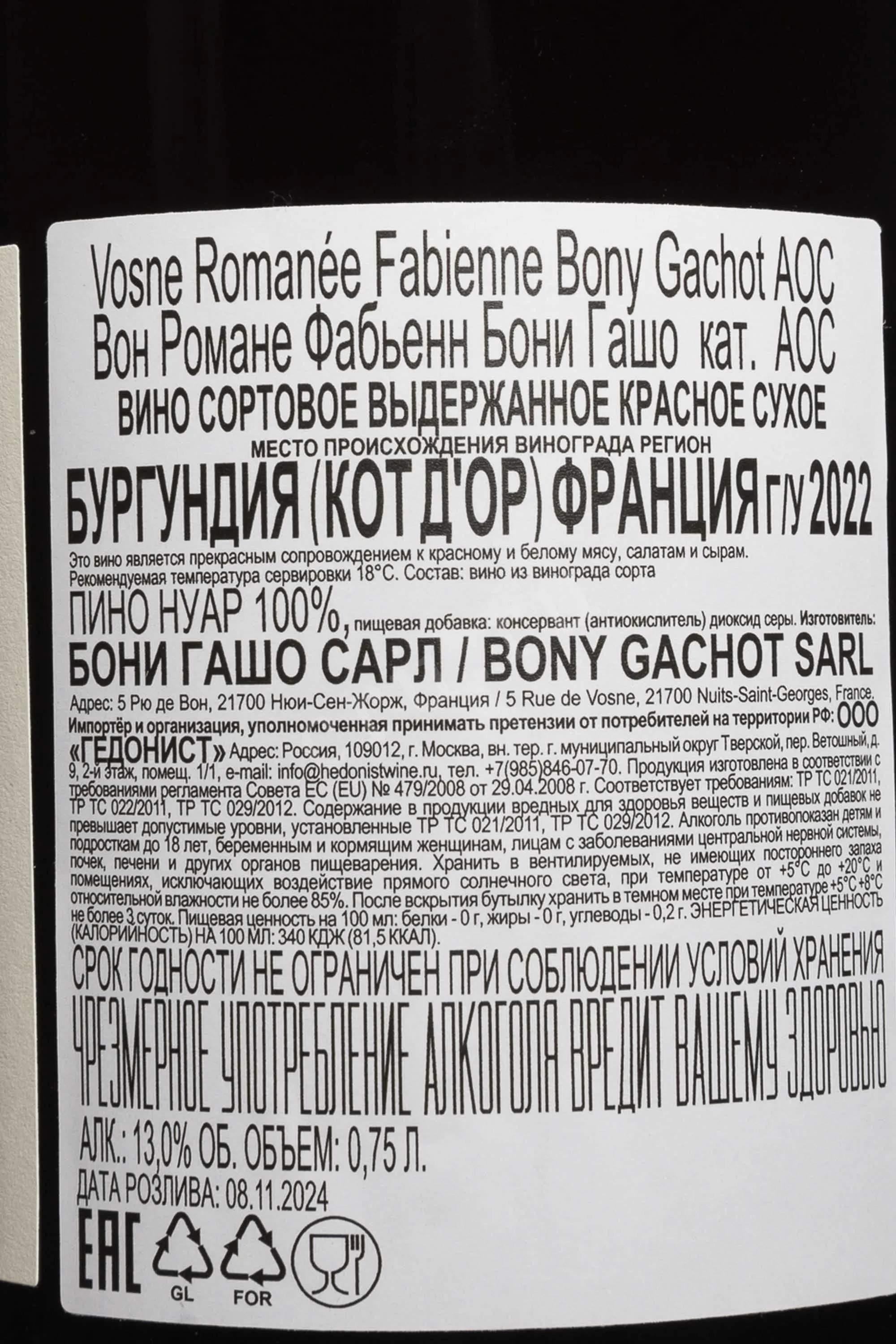 Красное сухое вино Domaine Bony Gachot Vosne-Romanee AOC 2022 г. 0,75 л передаёт классический и одновременно деликатный стиль бургундского апелласьона Вон-Романе. Местные склоны состоят из плотного известняка, покрытого тонким глинистым слоем, что ограничивает рост лоз и усиливает концентрацию ягод. Микроклимат здесь ровный, тёплый, виноград в нём созревает медленно и гармонично. Урожай собирают вручную. После сортировки ягоды ферментировали на мезге в открытых чанах с тщательно отмеренным пижажем и ремонтажем. На кожице сусло провело не менее двух недель, а после его отправили в дубовые бочки, на треть — новые. Выдержка в контакте с древесиной длилась не менее года.