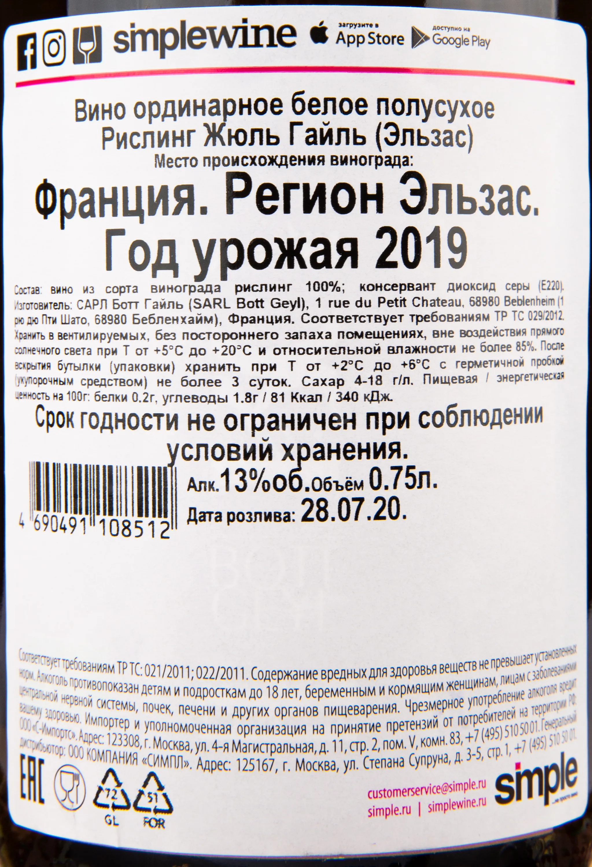 Вино Domaine Bott-Geyl Riesling Jules Geyl 2019 г. 0.75 l – это изысканный французский напиток крепостью 13%, созданный из вручную собранного урожая одного года. Ягоды сначала отправляют под пневматический пресс, после чего сок декантируют в течение суток при температуре 6 °С для удаления грубых частиц. Затем напиток сбраживают около полугода и выдерживают на тонком осадке от 4-х до 8 месяцев в резервуарах из нержавеющей стали. Готовое белое полусухое вино имеет потенциал хранения до 12 лет.