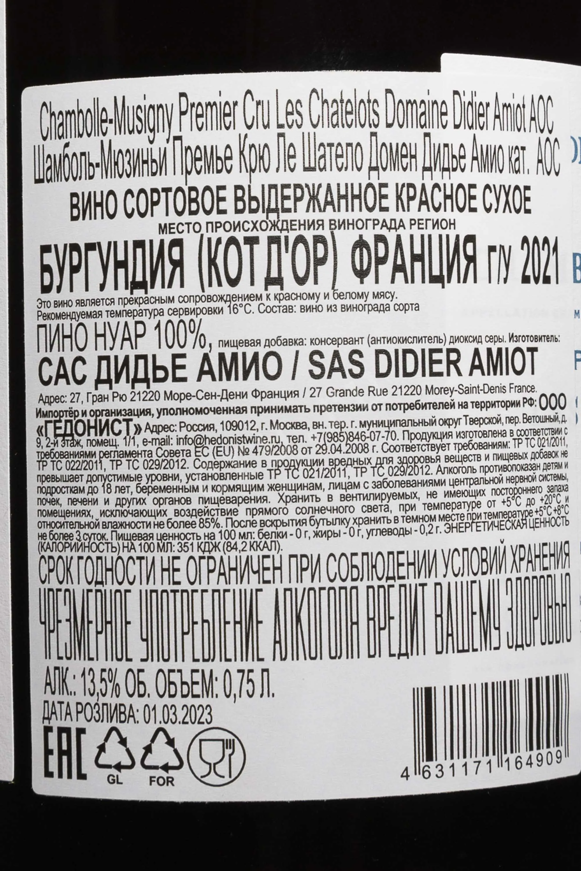 Красное сухое вино Domaine Didier Amiot Les Chatelots Chambolle-Musigny Premier Cru AOC 2021 г. 0,75 л раскрывает утонченный характер терруаров Шамболь-Мюзиньи. Участок Ле Шатело расположен на почвах среднеюрского происхождения, где плотный известняк сочетается с тонким слоем глинисто-известковой смеси. Эти условия заставляют лозу медленно развиваться вглубь земли. Урожай собирали вручную в небольшие проветриваемые ящики, затем — тщательную сортировали на вибростоле. Перед началом брожения сусло выдержали в холоде несколько дней, после чего чередовали мягкий пижаж и ремонтаж. Брожение проходило на диких дрожжах в течение 10 дней с контролем температуры, а в процессе выдержки напиток созревал в 228-литровых бочках из французского дуба. Розлив провели спустя 15–18 месяцев контакта с древесиной.