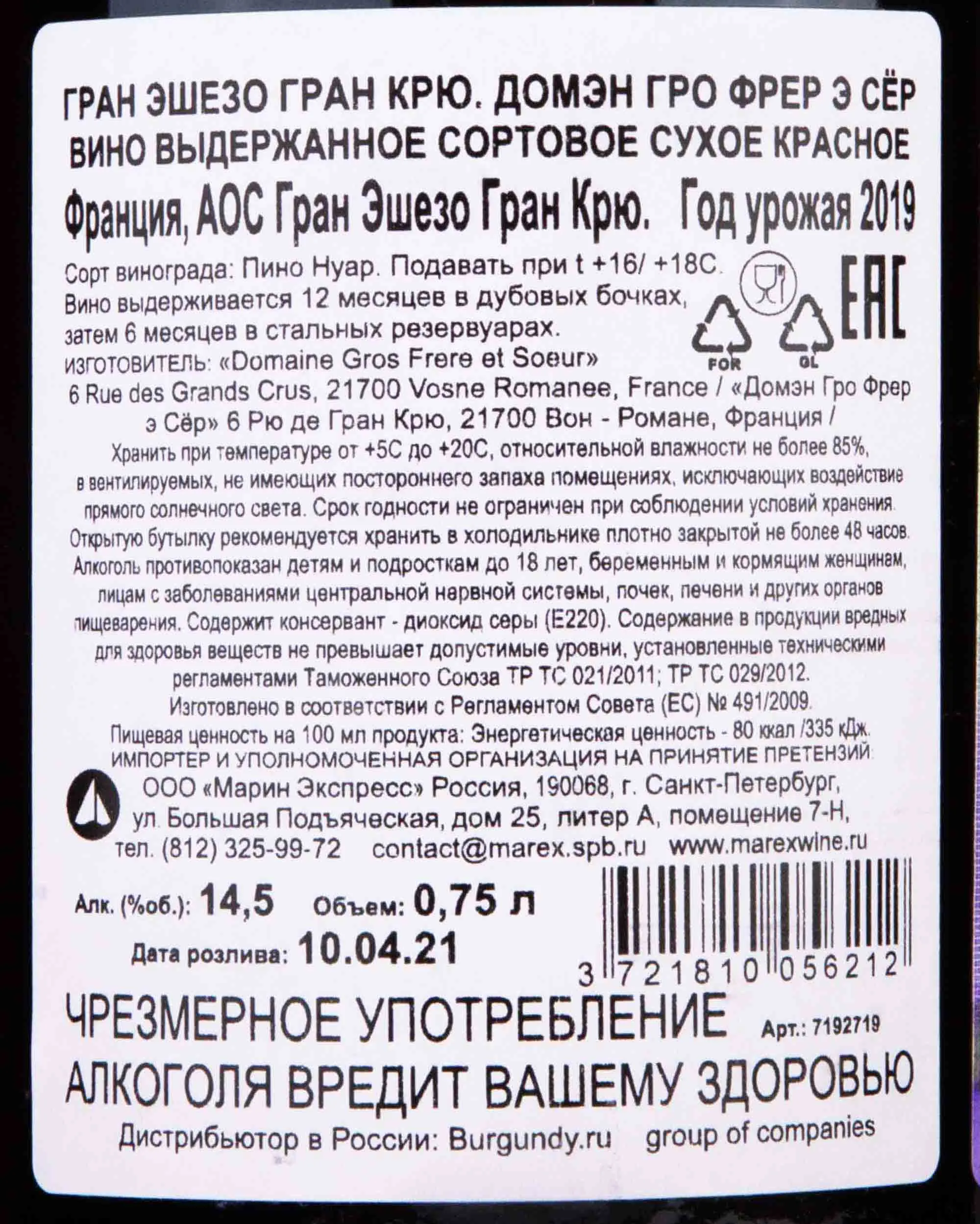 Изготовитель: Domaine Gros Frere et Soeur