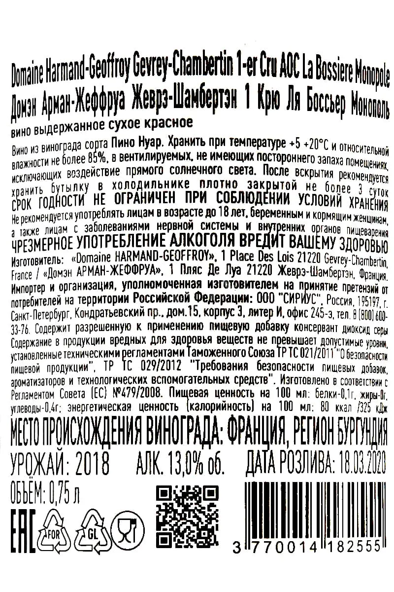 Domaine Harmand-Geoffroy Gevrey-Chambertin 1er Cru La Bossier Monopole 2018 0.75 л купить - Французское вино Домэн Арман-Жеффруа Жеврэ-Шамбертэн Премьер Крю Ля Боссьер Монополь цена в магазинег. Москва, ул. Профсоюзная, д. 16/1010:00-22:00 Ежедневно+7 (495) 920-20-02info@cru.ru