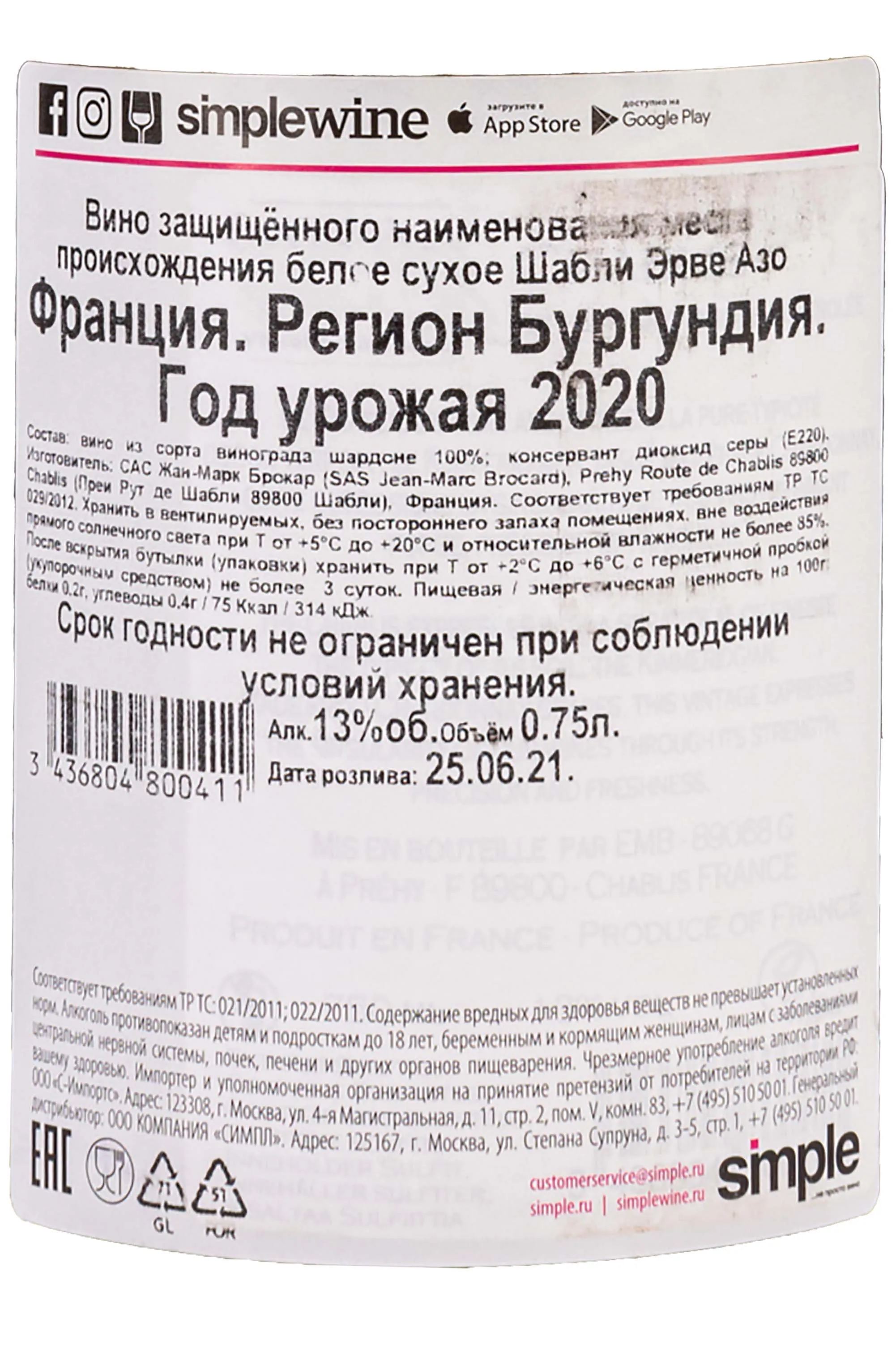 Domaine Herve Azo Chablis 2020 0.75 л купить - Французское вино Домен Эрве Азо Шабли цена в магазине г. Москва, ул. Профсоюзная, д. 16/10 10:00-22:00 Ежедневно +7 (495) 920-20-02 info@cru.ru