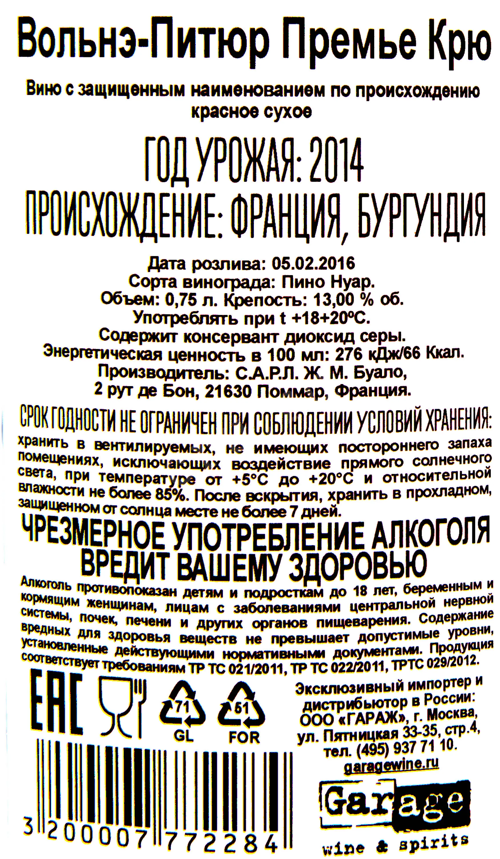 Вольнэ-Петюр Премье Крю Домэн Ж.М.Буало 2014 0.75
