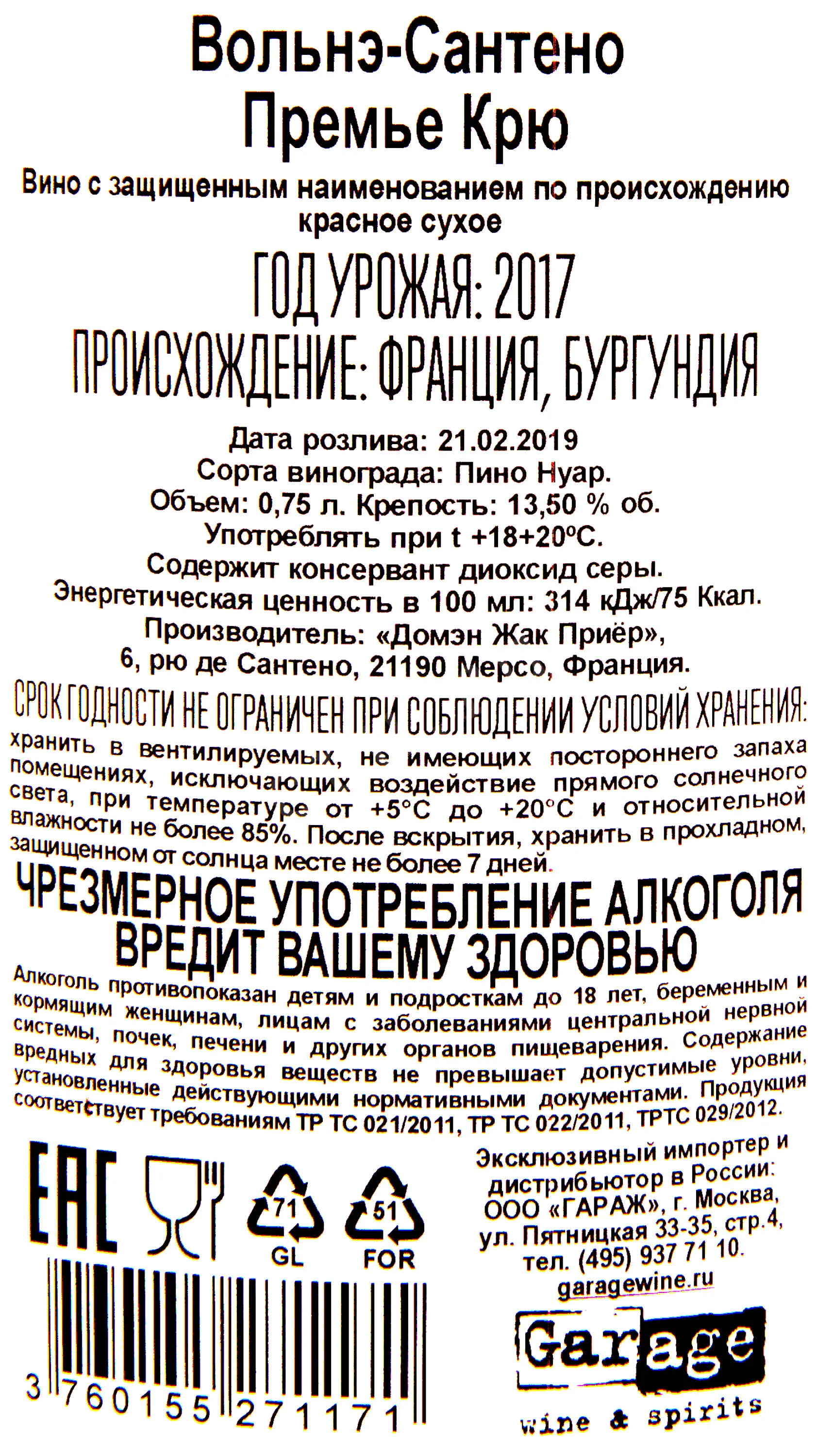 Domaine Jacques Prieur Volnay Santenots Premier Cru 2012 0.75 л купить - Французское вино Вольнэ Сантено Премье Крю цена в магазине г. Москва, ул. Профсоюзная, д. 16/10 10:00-22:00 Ежедневно +7 (495) 920-20-02 info@cru.ru