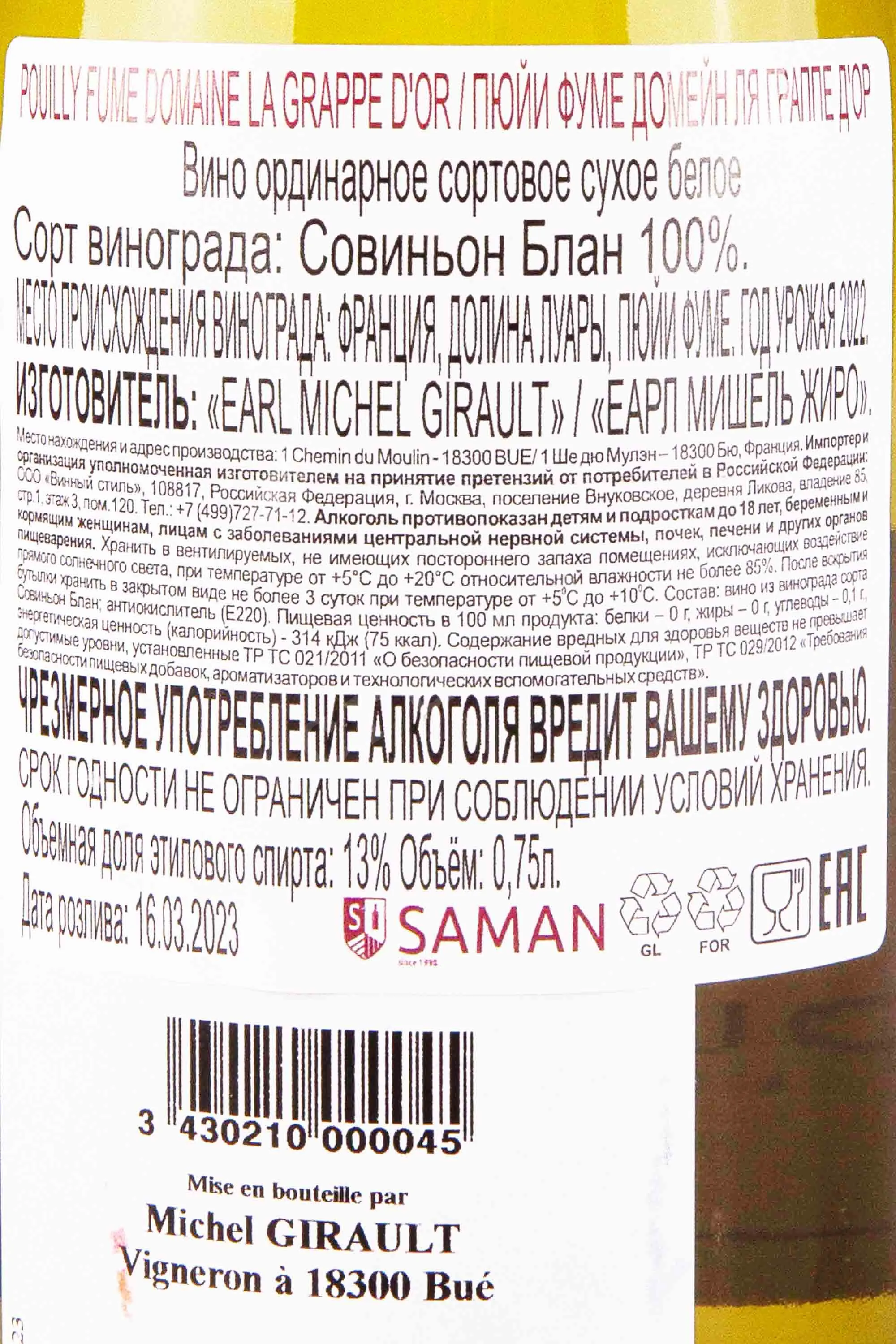 Domaine la Grappe d'Or Pouilly-Fume 0.75 л купить - Французское вино Домейн Ля Граппе Д’Ор Пюйи Фуме цена в магазине г. Москва, ул. Профсоюзная, д. 16/10 10:00-22:00 Ежедневно +7 (495) 920-20-02 info@cru.ru