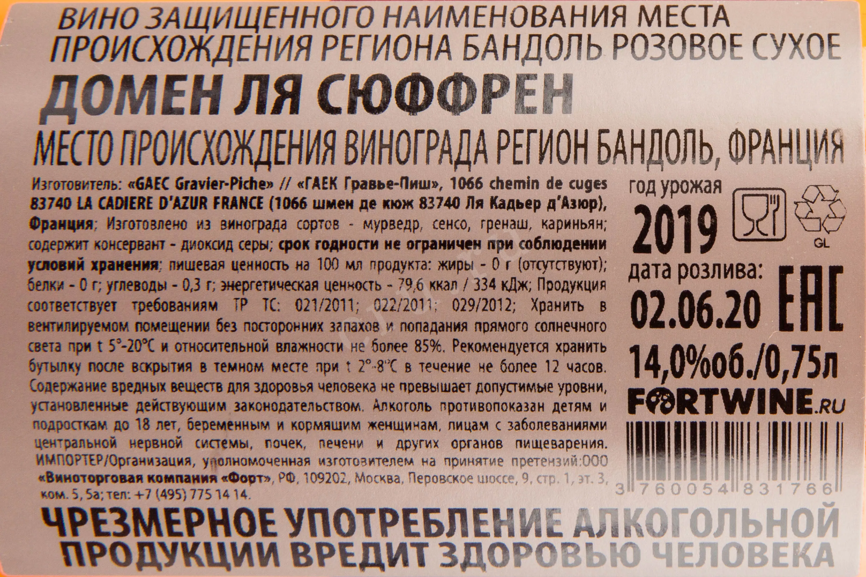 - Сорта винограда: Мурведр 40%, Сенсо 30%, Гренаш 20%, Кариньяно 10%.