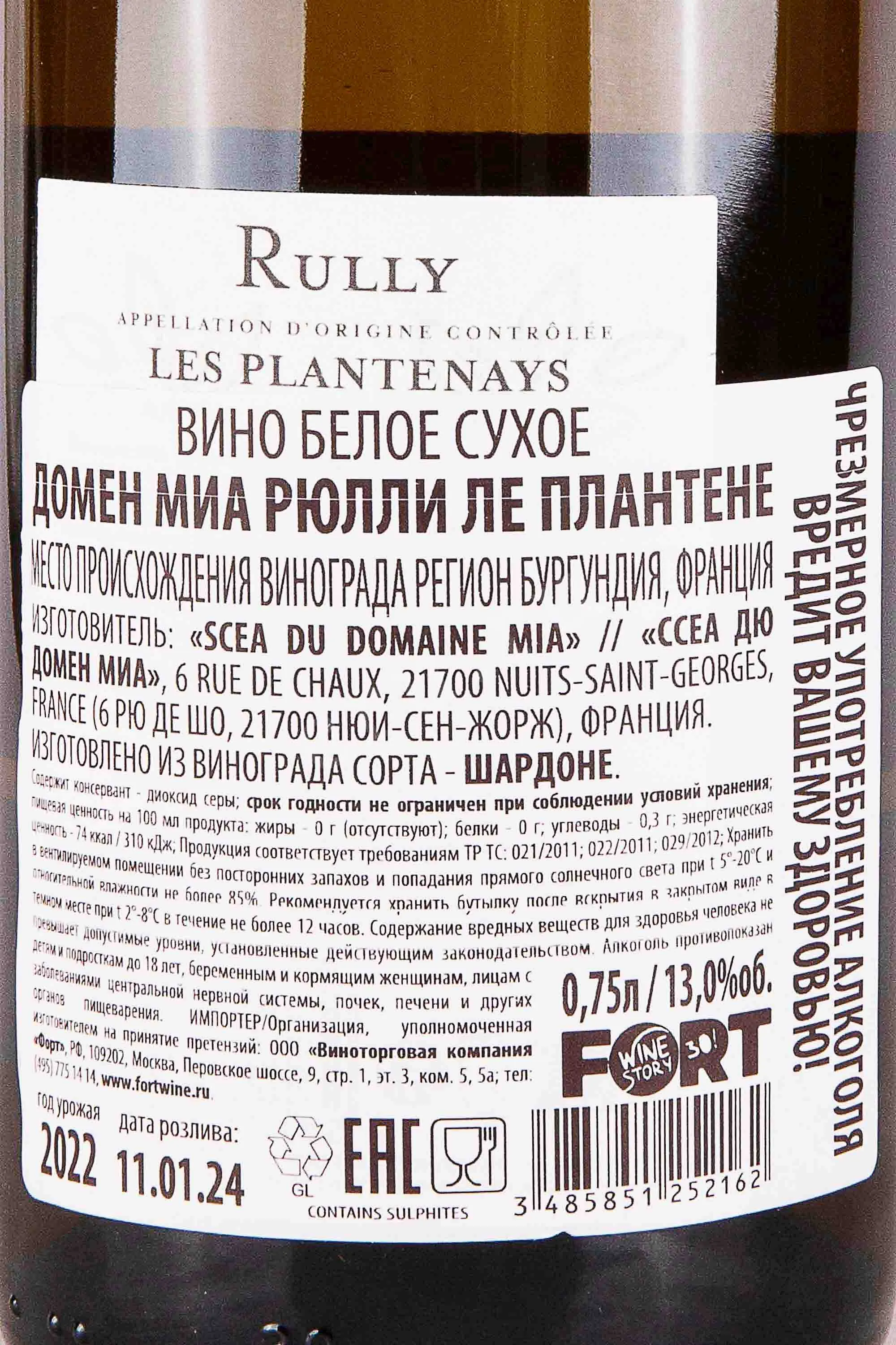 Domaine MIA Rully Les Plantenays 0.75 л купить - Французское вино Домен МИА Рюлли Ле Плантене цена в магазине г. Москва, ул. Профсоюзная, д. 16/10 10:00-22:00 Ежедневно +7 (495) 920-20-02 info@cru.ru