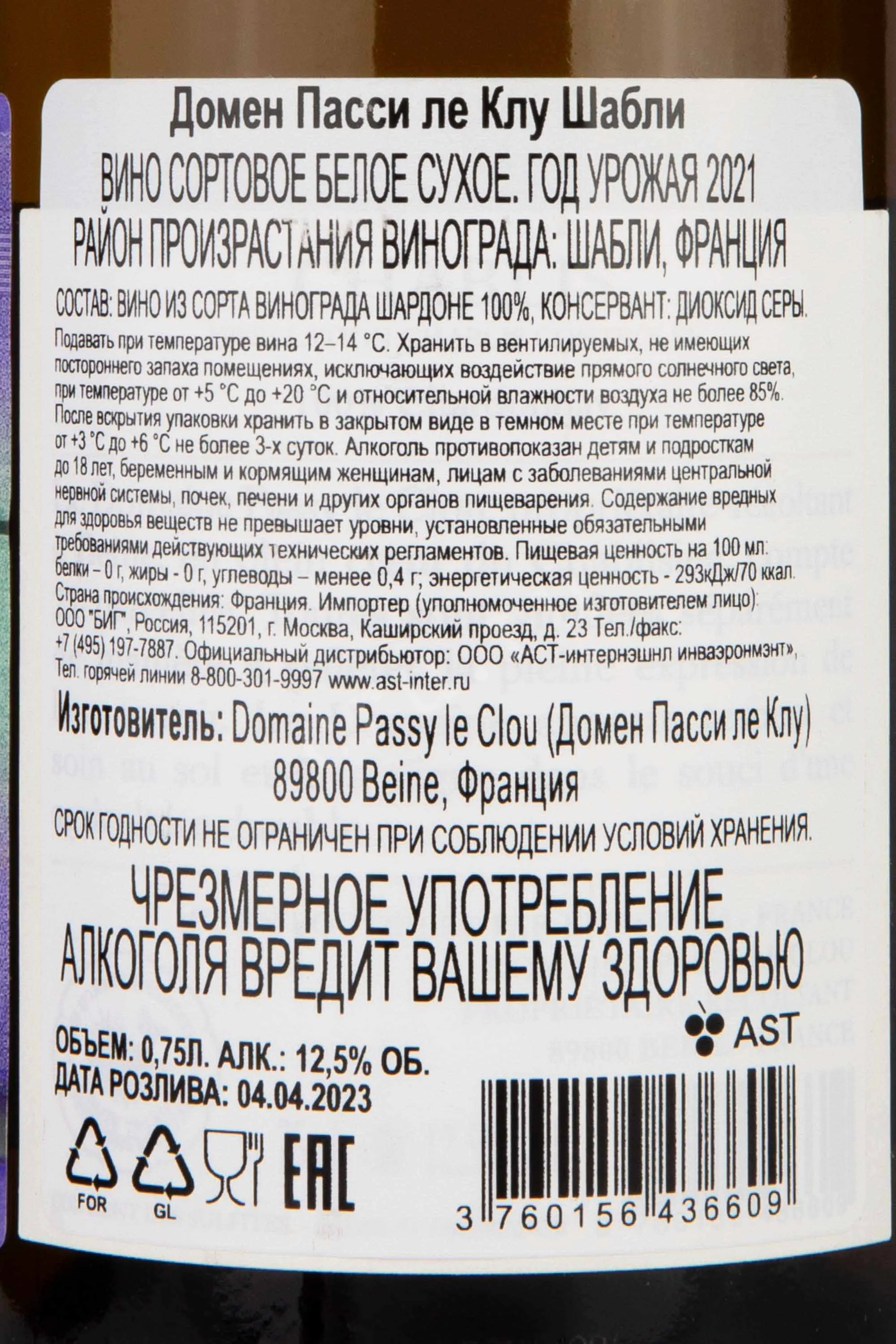 Вино Domaine Passy le Clou Chablis 2021 0.75 л