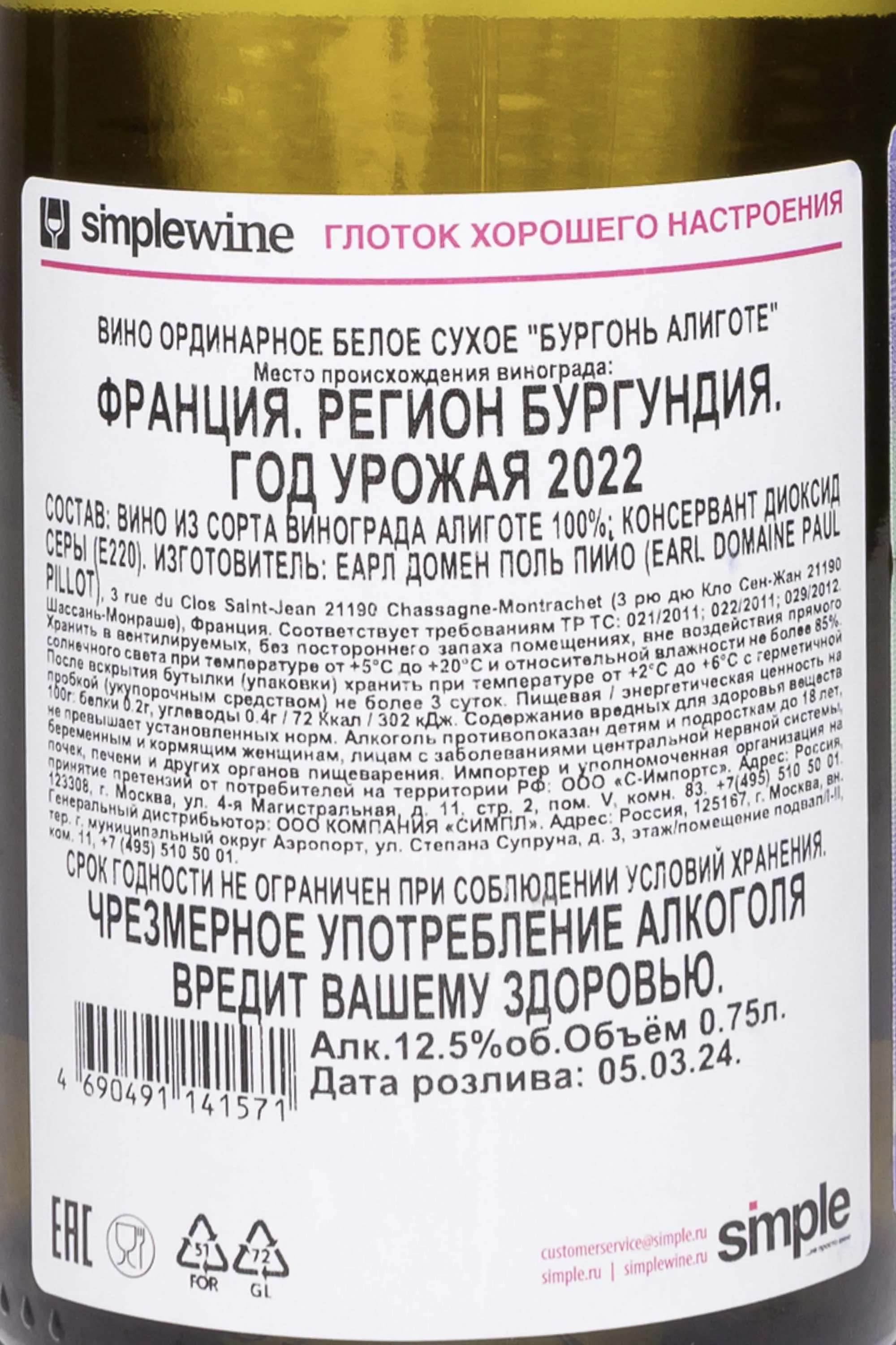 Белое сухое вино Domaine Paul Pillot Bourgogne Aligote AOC 2022 года 0,75 л создано в классическом бургундском стиле с акцентом на свежесть и минеральность. Виноград выращен на двух участках, где глинисто-известковые почвы и каменистые подпочвы дают лозам устойчивость и яркое выражение терруара. Климат в регионе полусредиземноморский, что означает достаточное количество солнечных дней и мягкие перепады температур. Урожай 2022 года был удачным: лето оказалось сухим, но не экстремально жарким, ягоды набрали оптимальный баланс сахара и кислотности. В хозяйстве Поль Пийо соблюдаются органические практики, сбор урожая производится вручную. Брожение проходит на естественных дрожжах при контролируемой температуре. Выдержка занимает около 12 месяцев в дубовых бочках объемом 350 литров, из которых 10% новые, затем вино еще полгода стабилизируется в стальных емкостях. Это придает напитку гармонию и тонкий баланс между свежестью и структурой. Винтаж 2022 года имеет потенциал 15 лет.