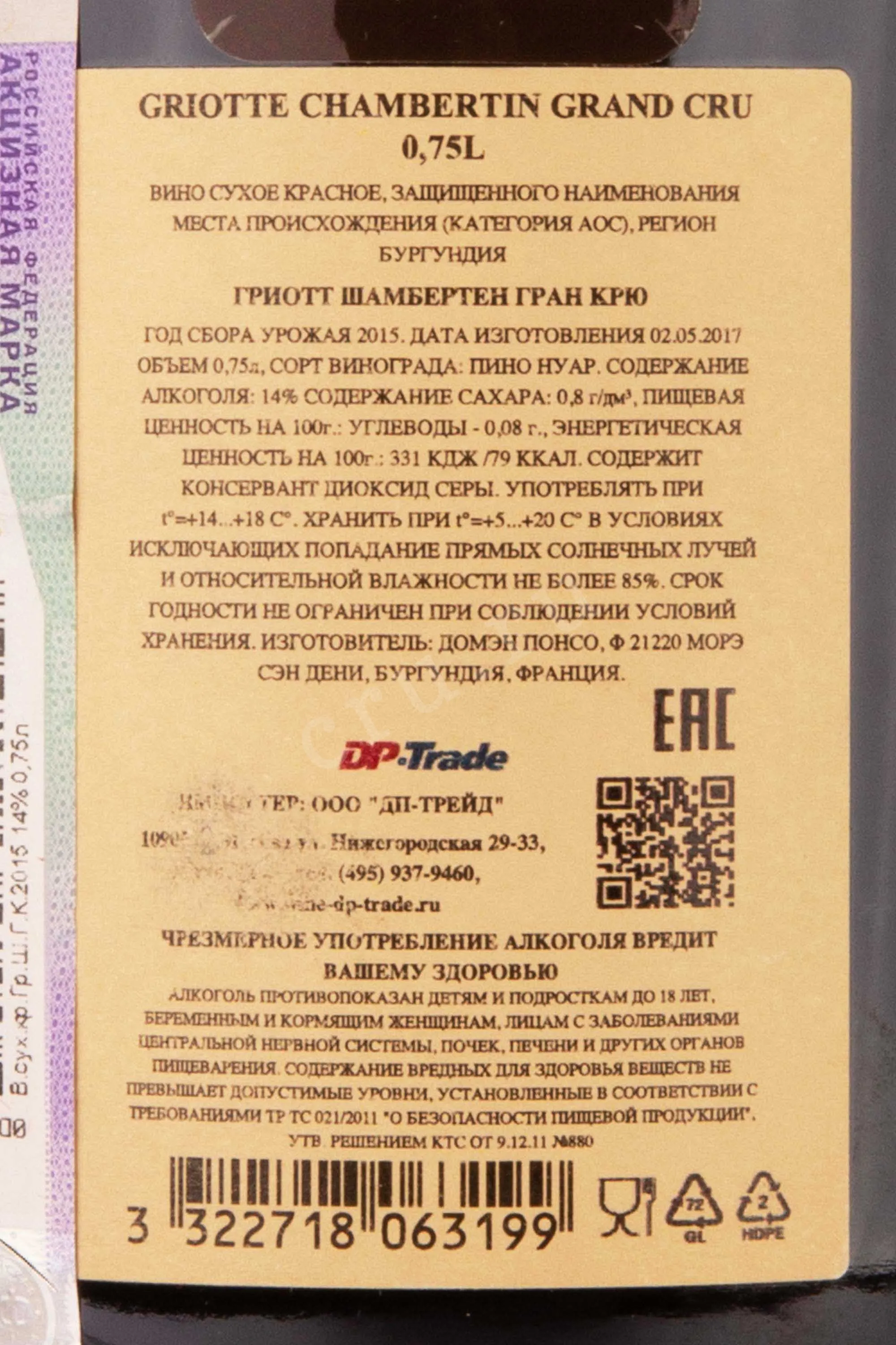 Domaine Ponsot Griotte Chambertin Grand Cru AOC 2015 0.75 л купить - Французское вино Домен Понсо Гриотт Шамбертен Гран Крю АОС цена в магазине г. Москва, ул. Профсоюзная, д. 16/10 10:00-22:00 Ежедневно +7 (495) 920-20-02 info@cru.ru