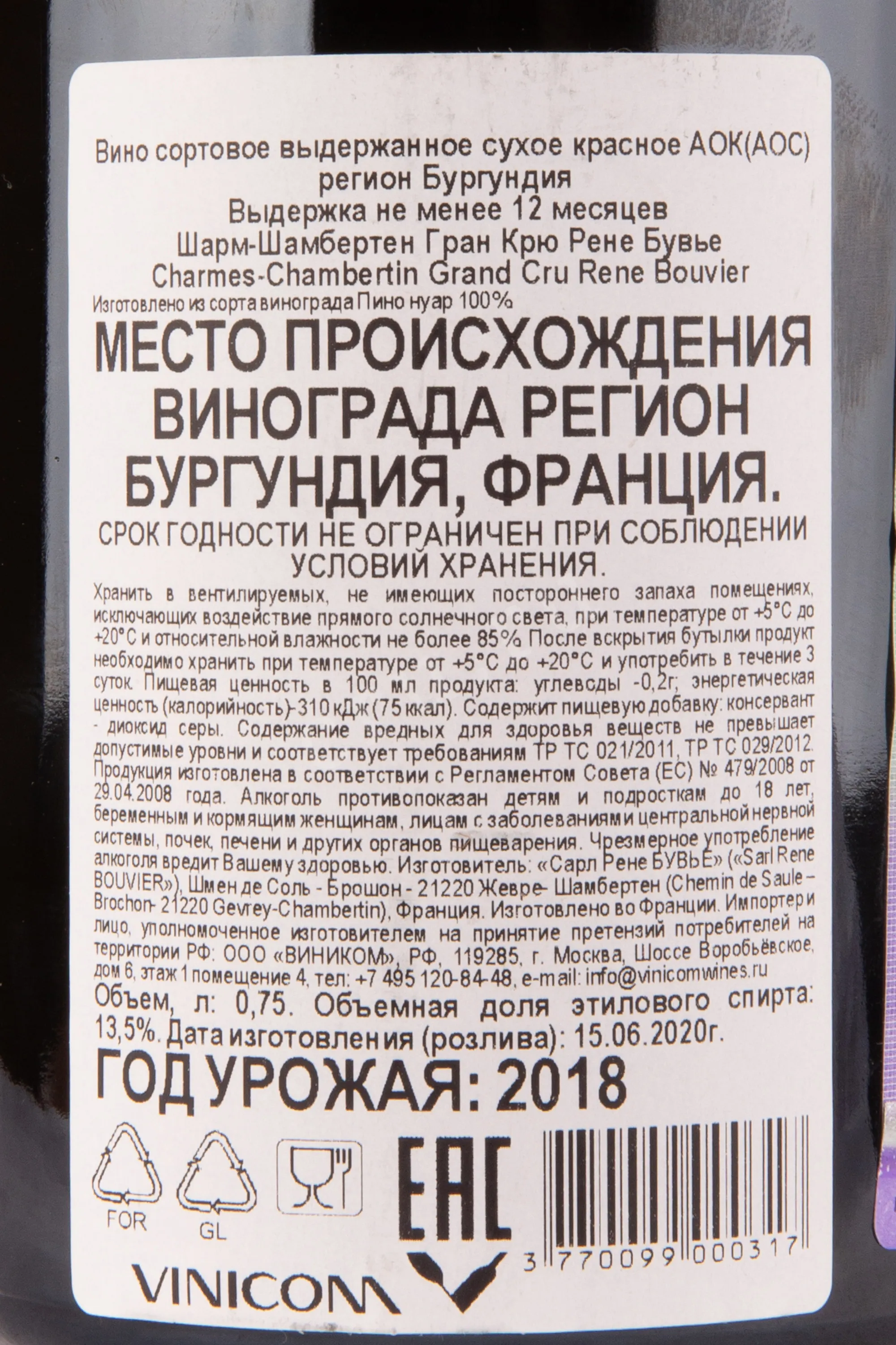 Шарм-Шамбертен Гран Крю Рене Бувье 2018 0.75