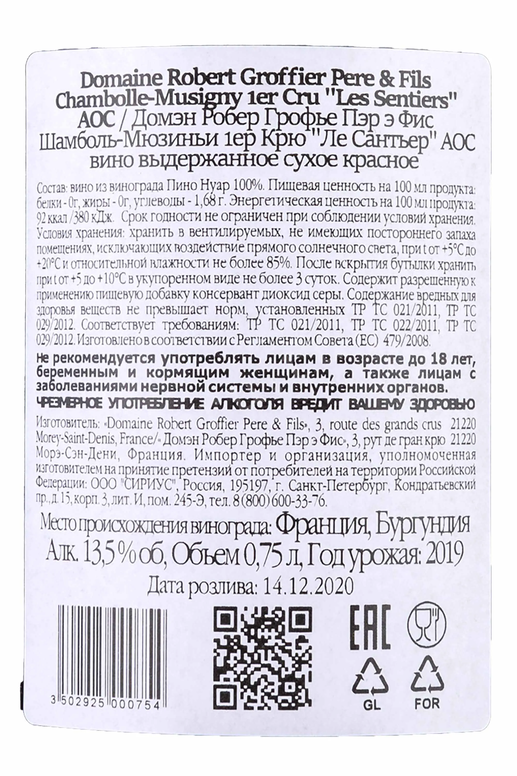 Domaine Robert Groffier Pere & Fils, Chambolle-Musigny 1er Cru Les Sentiers 2019 0.75 л купить - Французское вино Домэн Робер Грофье Пэр э Фис ШАМБОЛЬ-МЮЗИНЬИ 1 Крю Ле Сантьер цена в магазинег. Москва, ул. Профсоюзная, д. 16/1010:00-22:00 Ежедневно+7 (495) 920-20-02info@cru.ru