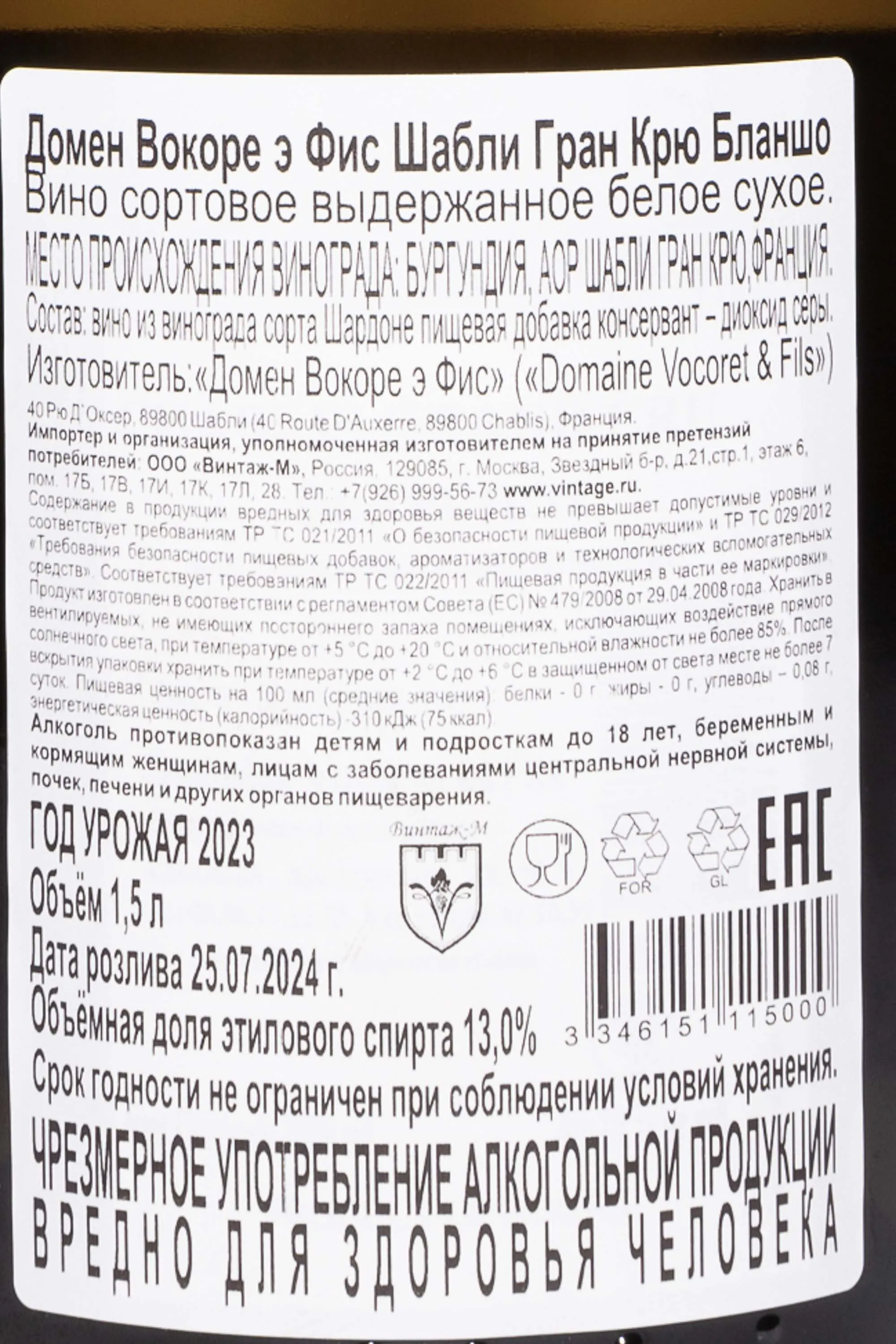 Белое сухое вино Domaine Vocoret et Fils Blanchot Chablis Grand Cru AOC 2023 года 1,5 л — это образец классического стиля Шабли высочайшего уровня. Урожай винограда был собран на знаменитом винограднике Бланшо, расположенном на юго-восточном склоне холма Гран Крю, где известняковая почва с примесью глины придает сорту Шардоне минеральную чистоту и утонченную свежесть. 2023 год был удачным для региона: умеренные дожди весной и теплое лето позволили ягодам достичь гармоничного баланса сахара и кислотности. Виноград собирали вручную с лоз возрастом более 50 лет. После мягкого прессования сусло проходило ферментацию и яблочно-молочное брожение в нержавеющих чанах, что сохранило естественную чистоту вкуса. Выдержка длилась около десяти месяцев в дубовых бочках объемом 500 литров, дерево лишь мягко подчеркнуло структуру вина. Винтаж 2023 года обладает потенциалом выдержки до 15 лет и отмечен высокими оценками критиков за глубину и элегантность.