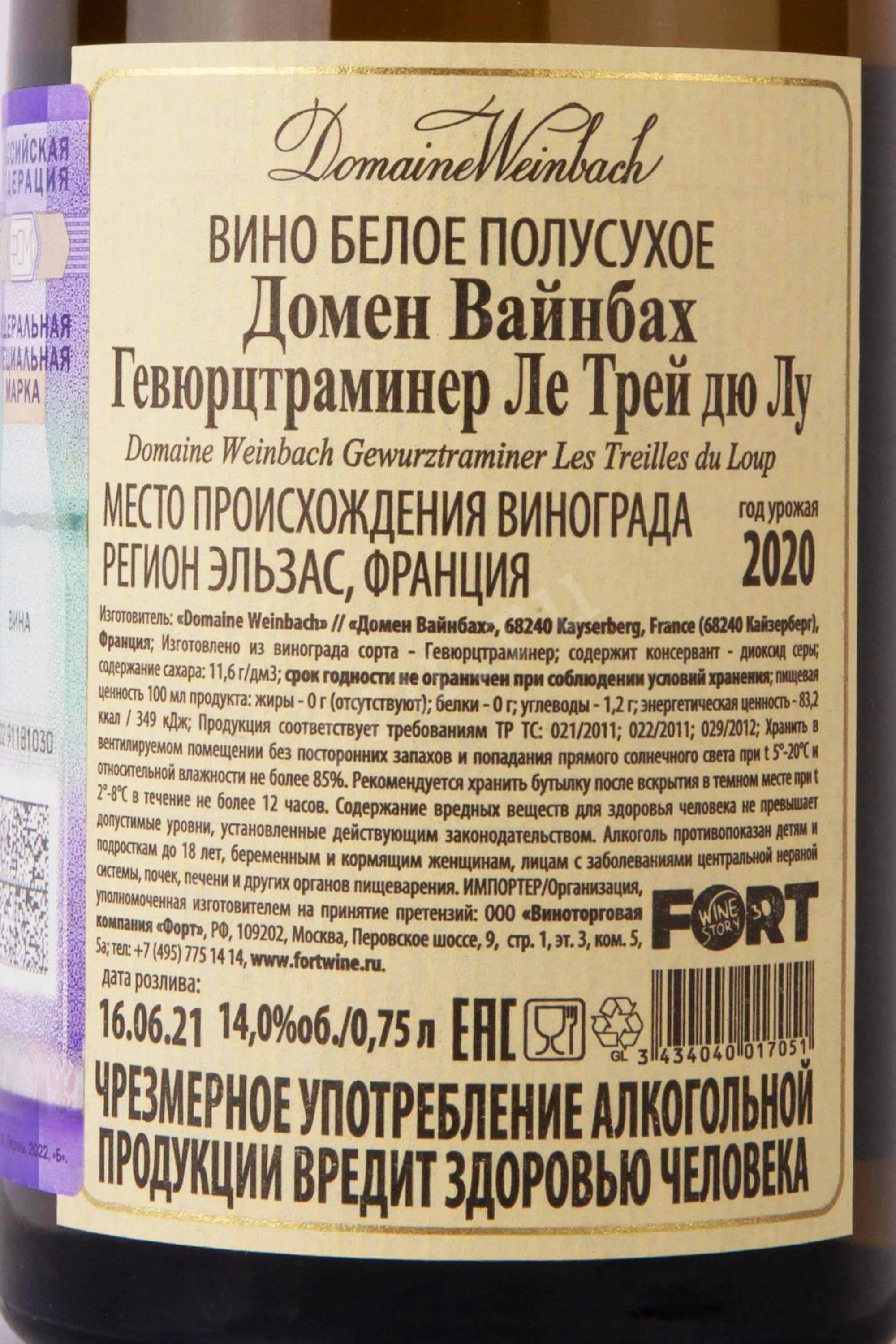 Domaine Weinbach Les Treilles du Loup Gewurztraminer Alsace AOC 0.75 л купить - Французское вино Домен Вайнбах Ле Трей дю Лу Гевюрцтраминер цена в магазине г. Москва, ул. Профсоюзная, д. 16/10 10:00-22:00 Ежедневно +7 (495) 920-20-02 info@cru.ru