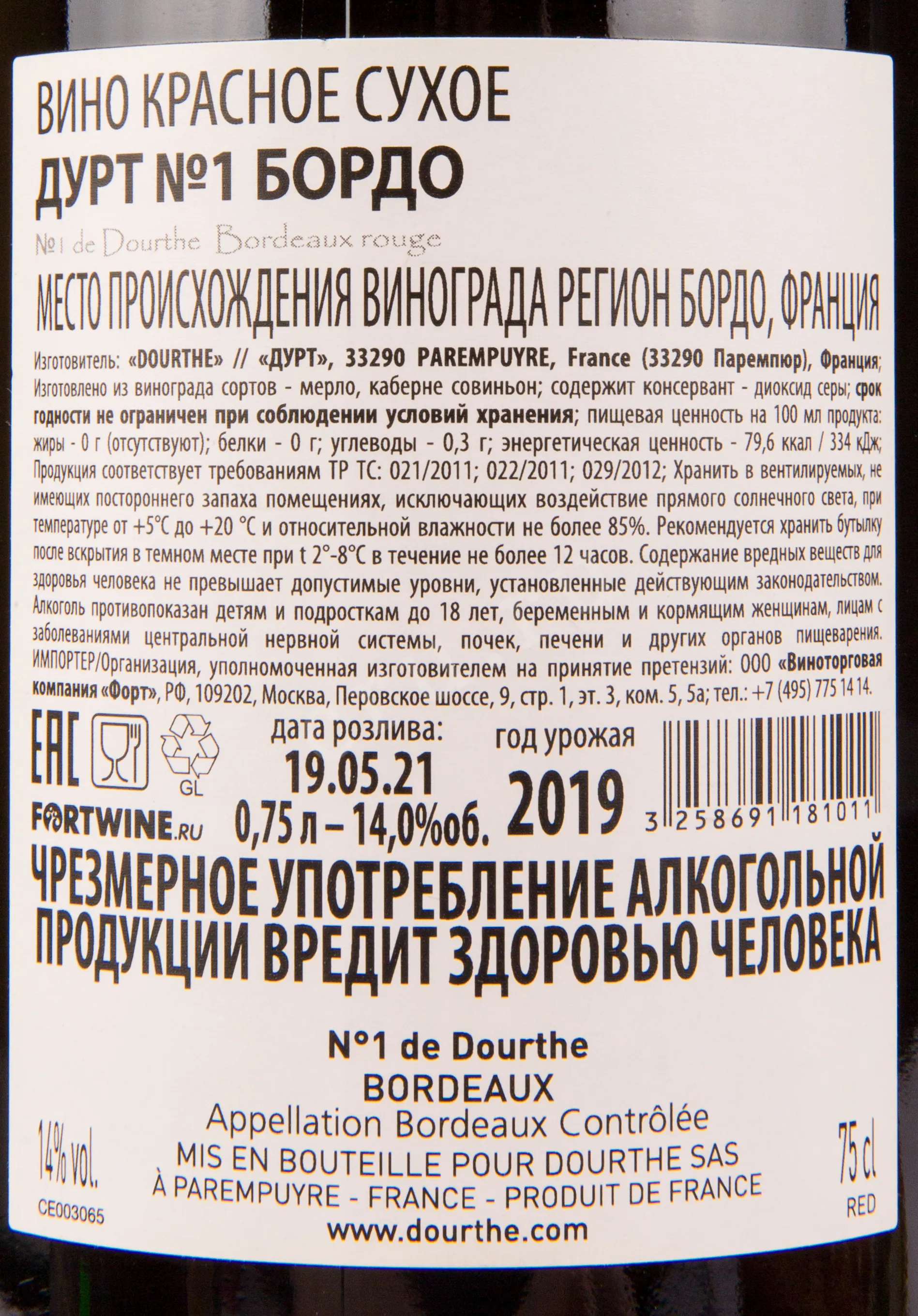 Dourthe №1 Bordeaux Rouge 0.75 л купить - Французское вино Дурт №1 Борд цена в магазине г. Москва, ул. Профсоюзная, д. 16/10 10:00-22:00 Ежедневно +7 (495) 920-20-02 info@cru.ru