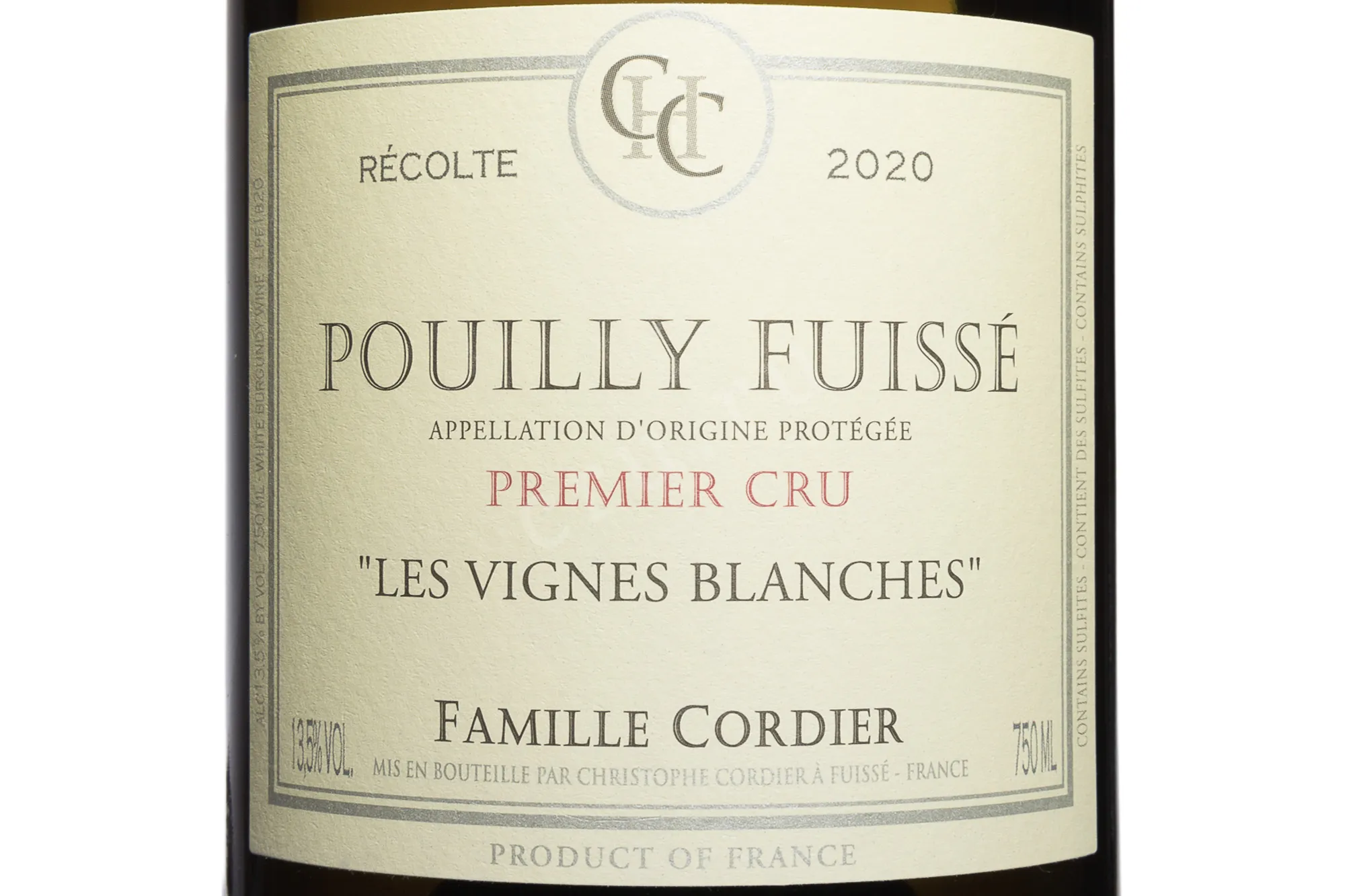 Белое сухое вино Famille Cordier Les Vignes Blanches Pouilly Fuisse Premier Cru AOC 2020 г. 0,75 л изготовлено в Фюиссе, где почвы состоят из глины и известняка. Этот участок занимает 0,98 га на восточном склоне на высоте 260 м. Виноградники включают лозы возрастом 35, 50 и 80 лет. Ухаживают залозами по нормам биологического земледелия Ecocert и биодинамики Demeter. Урожай собирают вручную по достижении зрелости. Ягоды прессуют мягко целыми гроздями, сусло перемещают в бочки самотёком. Брожение проходит естественным путём, а выдержка длится 12 месяцев в 350-литровых бочках и ещё 8 месяцев — в стальных резервуарах на полном осадке. Розлив осуществляют гравитационным методом, без осветления и с минимальной фильтрацией.