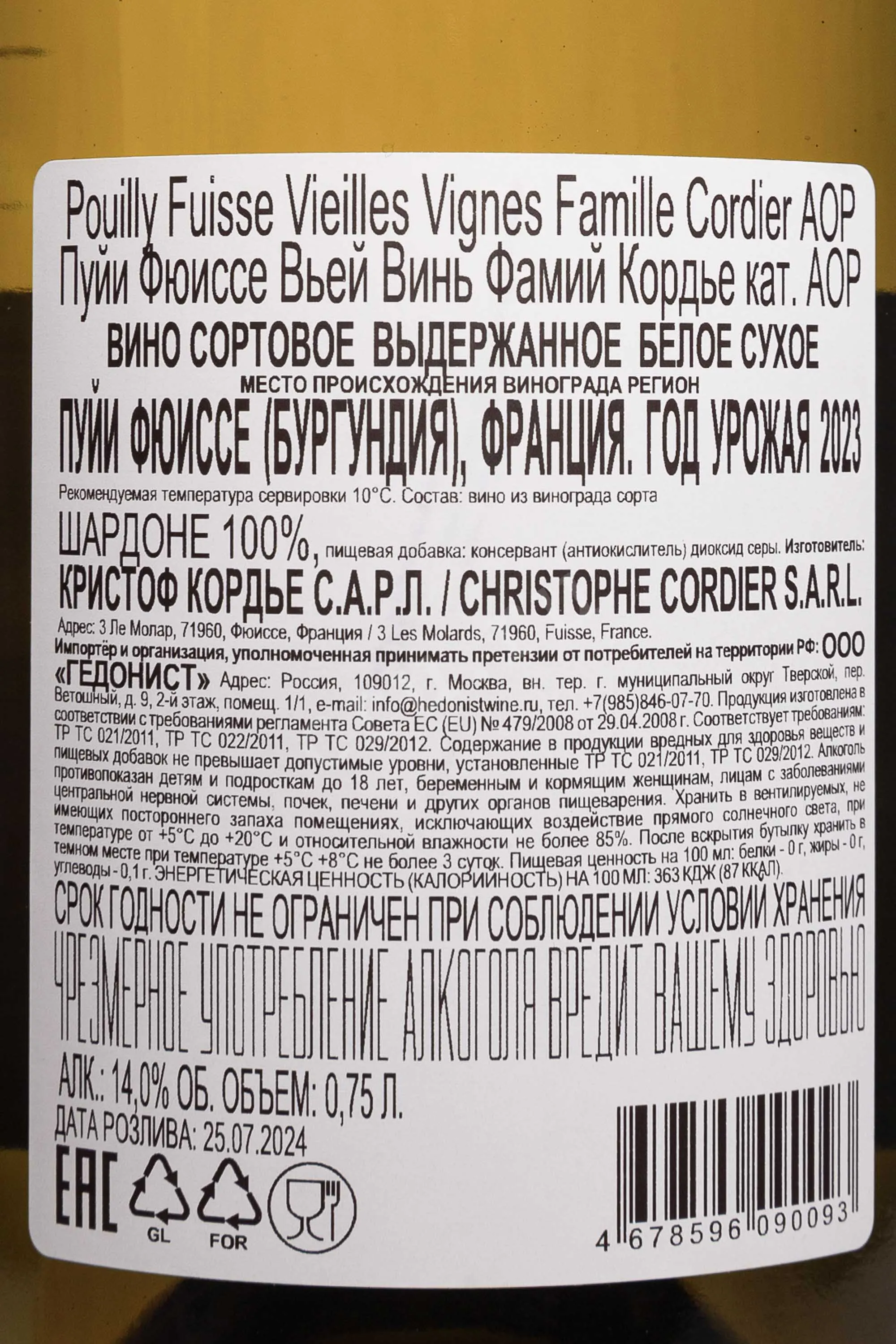 Белое сухое вино Famille Cordier Vielles Vignes Pouilly Fuisse AOC 2023 г. 0,75 л происходит из Маконне. Здесь известняковые склоны Пуйи и Фюиссе формируют свежий и чистый характер известного бургундского винограда, выращиваемого с применением принципов органики и биодинамики. Напиток отличается спокойной структурой, редкой точностью и акцентом на возраст лоз, которые дают низкий урожай, но с концентрированно й органолептикой. Плоды в тот сезон созрели равномерно, их собрали вручную и отсортировали. Брожение прошло при контролируемой температуре, а выдержка на осадке придала напитку мягкий объём и деликатную минеральную линию.