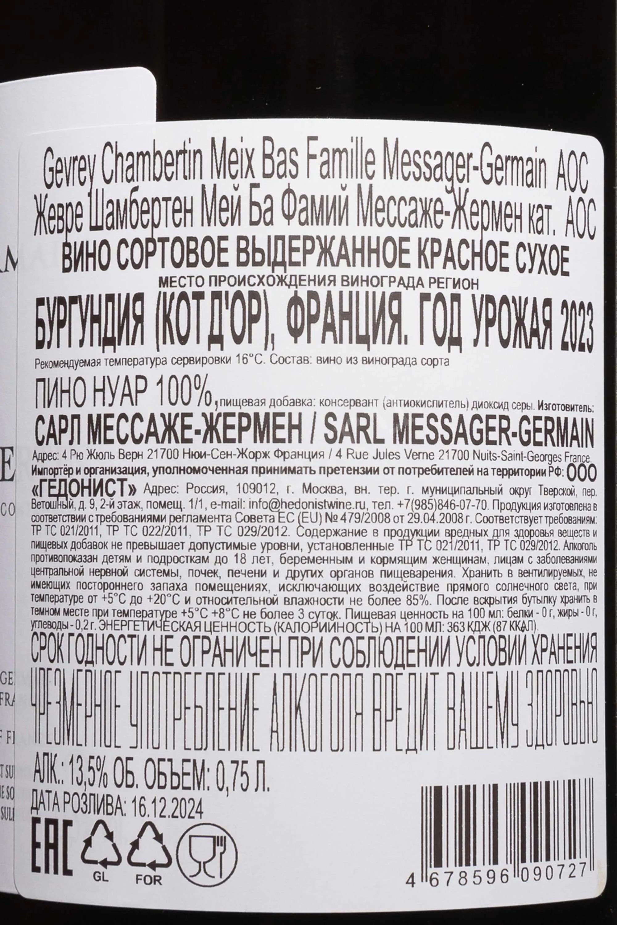 Красное сухое вино Famille Messager-Germain Meix-Bas Gevrey-Chambertin AOC 2023 г. 0,75 л представляет собой выдержанное выражение терруара северной части Кот-де-Нюи. Участок Мей Ба расположен у подножия холма, где почвы имеют более глубокий слой глины с включениями известняка. Эти грунты дают напитку плотность и устойчивую структуру. В умеренном климате с прохладными сумерками и умеренной инсоляцией ягоды созрели медленно и сохранили естественную кислотность. Производитель работает с небольшими участками и придерживается традиционной схемы: ручной сбор, тщательная сортировка, минимальное вмешательство в ходе брожения. Брожение проходило в чанах из стали при контролируемой температуре. Затем последовала выдержка в бочках из французского дуба не более года.