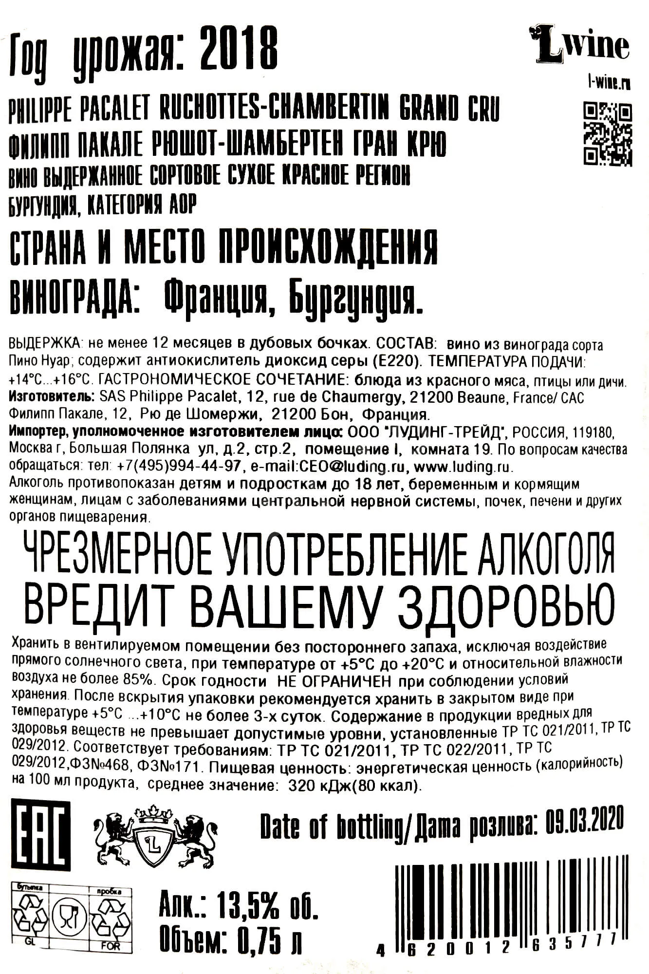 Филипп Пакале Рюшот-Шамбертен Гран Крю 2018 0.75