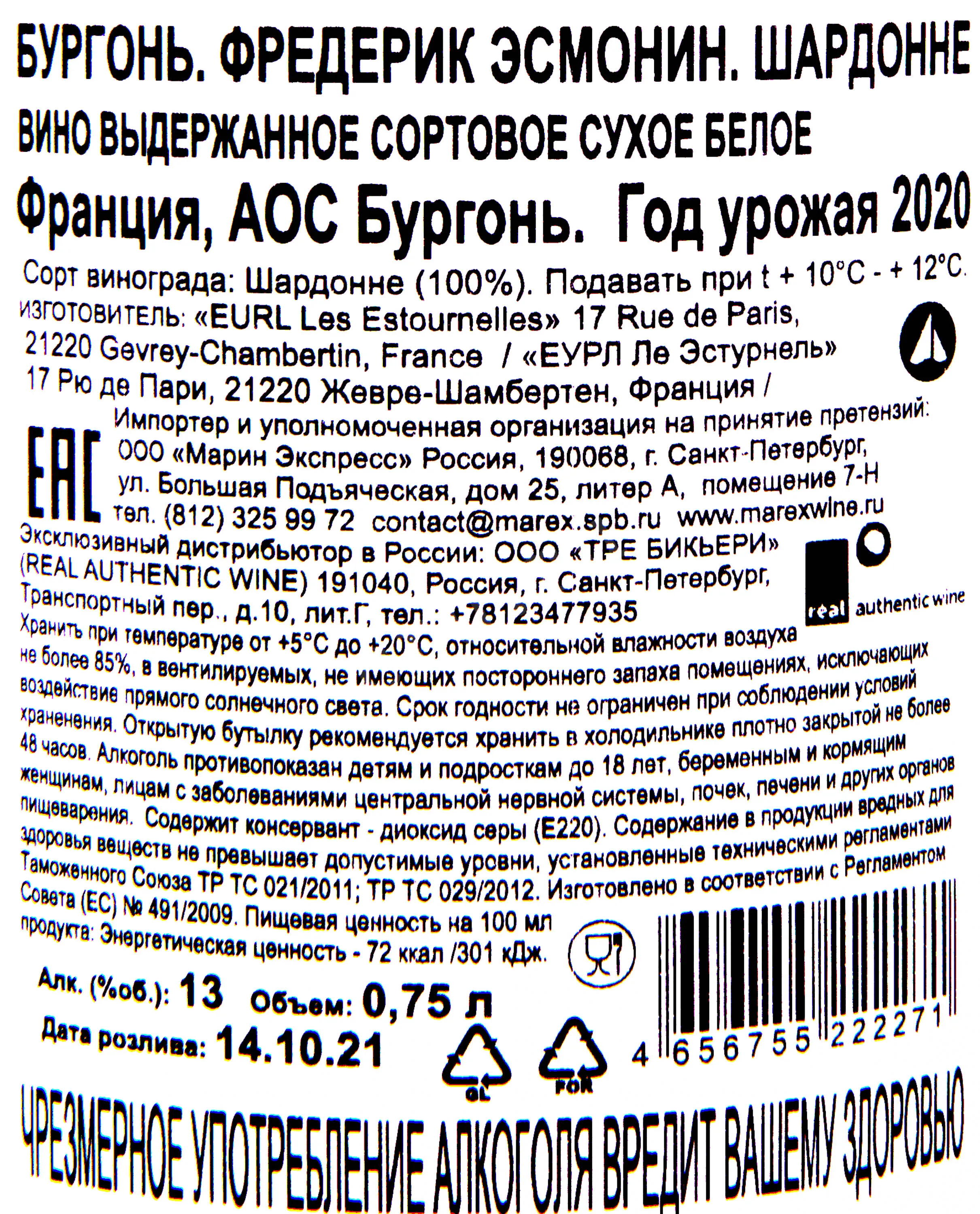 Бургонь Шардоне Фредерик Эсмонин 2020 0.75