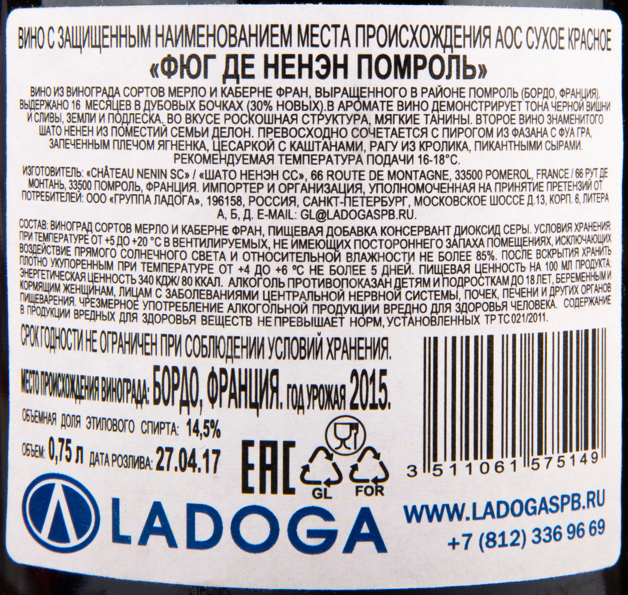 Фюг де Ненэн Помроль АОС 2015 0.75