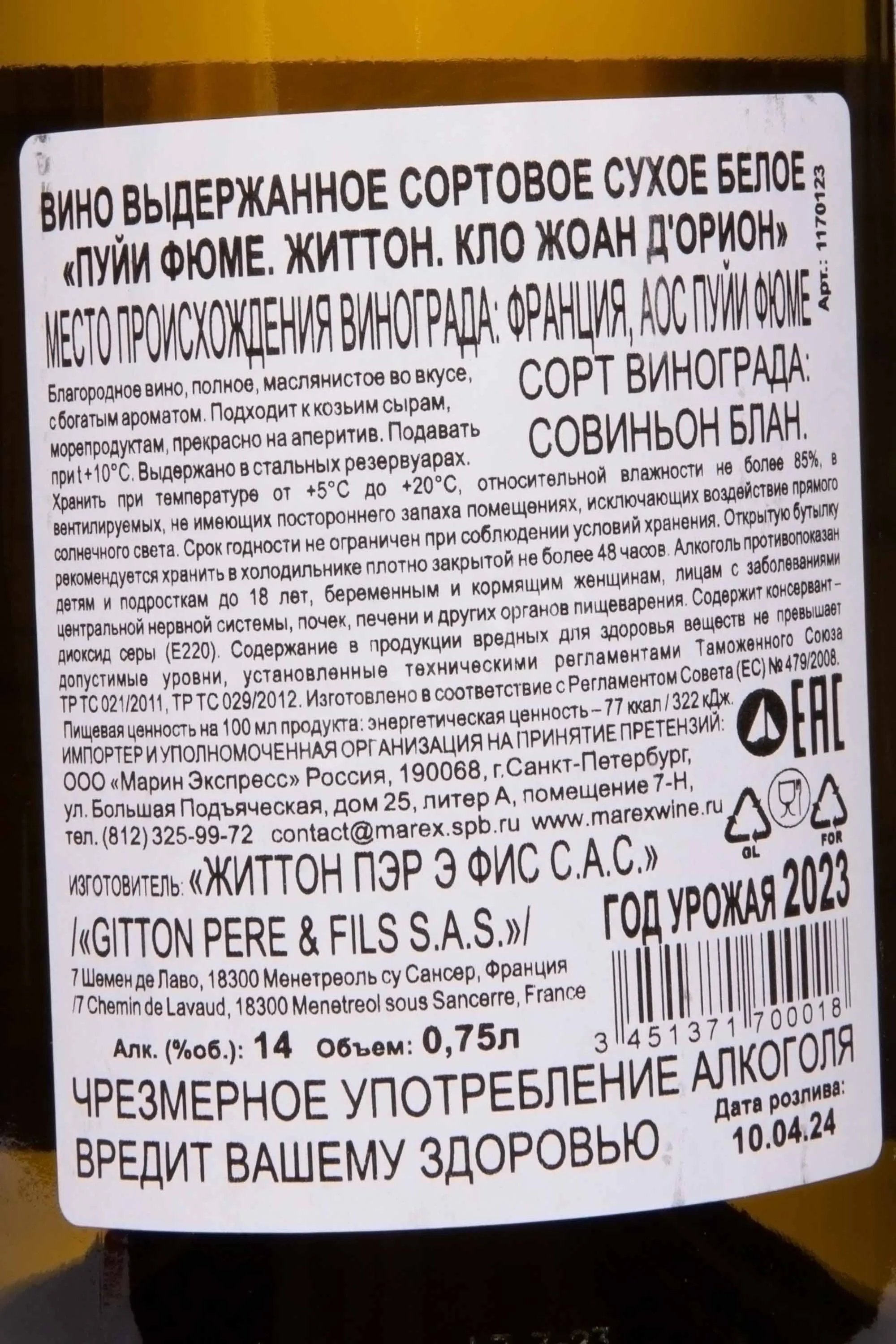 Gitton Pere Fils Pouilly Fume Clos Joanne d'Orion 0.75 л купить - Французское вино Життон Пере эт Филз Пуилли Фуме Клос Жоан д`Орион цена в магазинег. Москва, ул. Профсоюзная, д. 16/1010:00-22:00 Ежедневно+7 (495) 920-20-02info@cru.ru