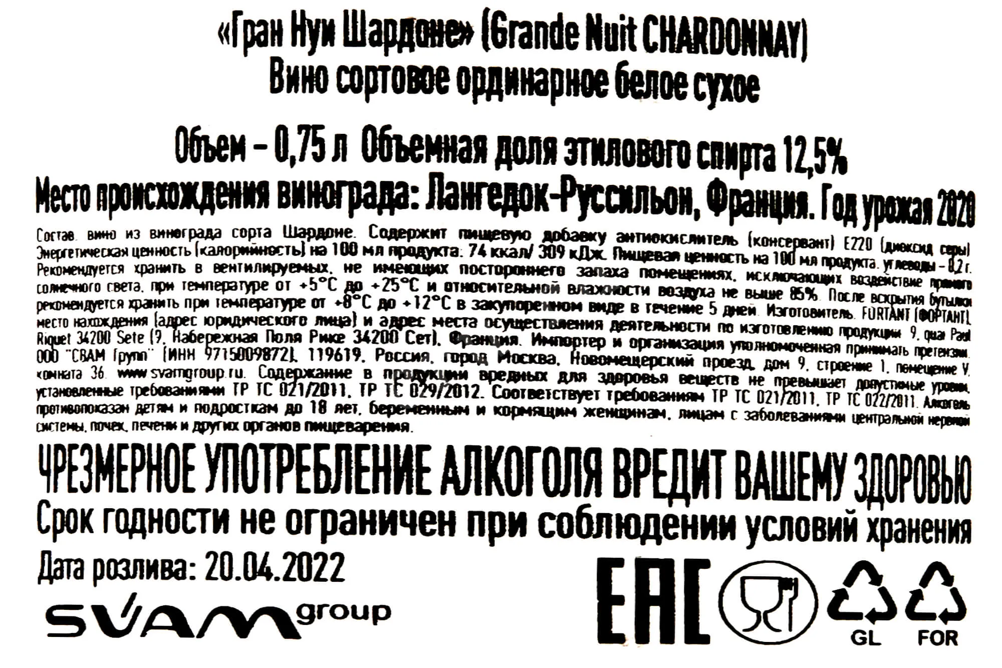 Grande Nuits Chardonnay 2020 0.75 л купить - Французское вино Гран Нуи Шардоне цена в магазинег. Москва, ул. Профсоюзная, д. 16/1010:00-22:00 Ежедневно+7 (495) 920-20-02info@cru.ru