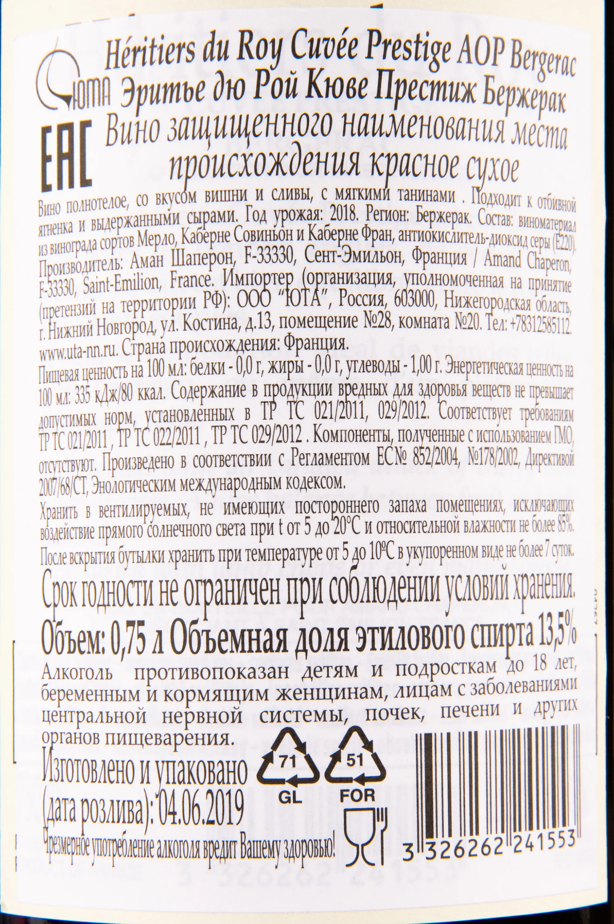 Эритье дю Рой Кюве Престиж Руж Бержерак 2018 0.75