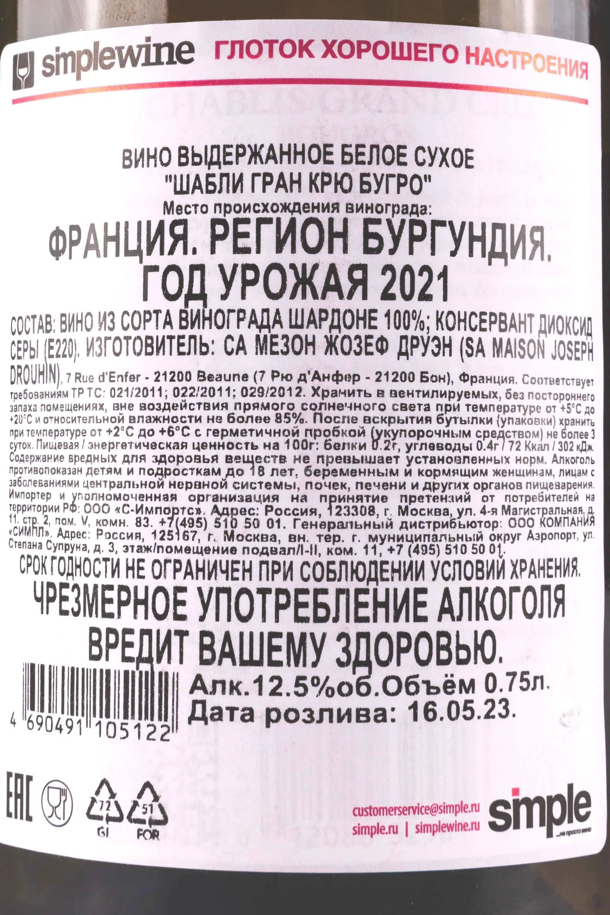 Joseph Drouhin Chablis Grand Cru Bougros 0.75 л купить - Французское вино Жозеф Друэн Шабли Гран Крю Бугро цена в магазинег. Москва, ул. Профсоюзная, д. 16/1010:00-22:00 Ежедневно+7 (495) 920-20-02info@cru.ru