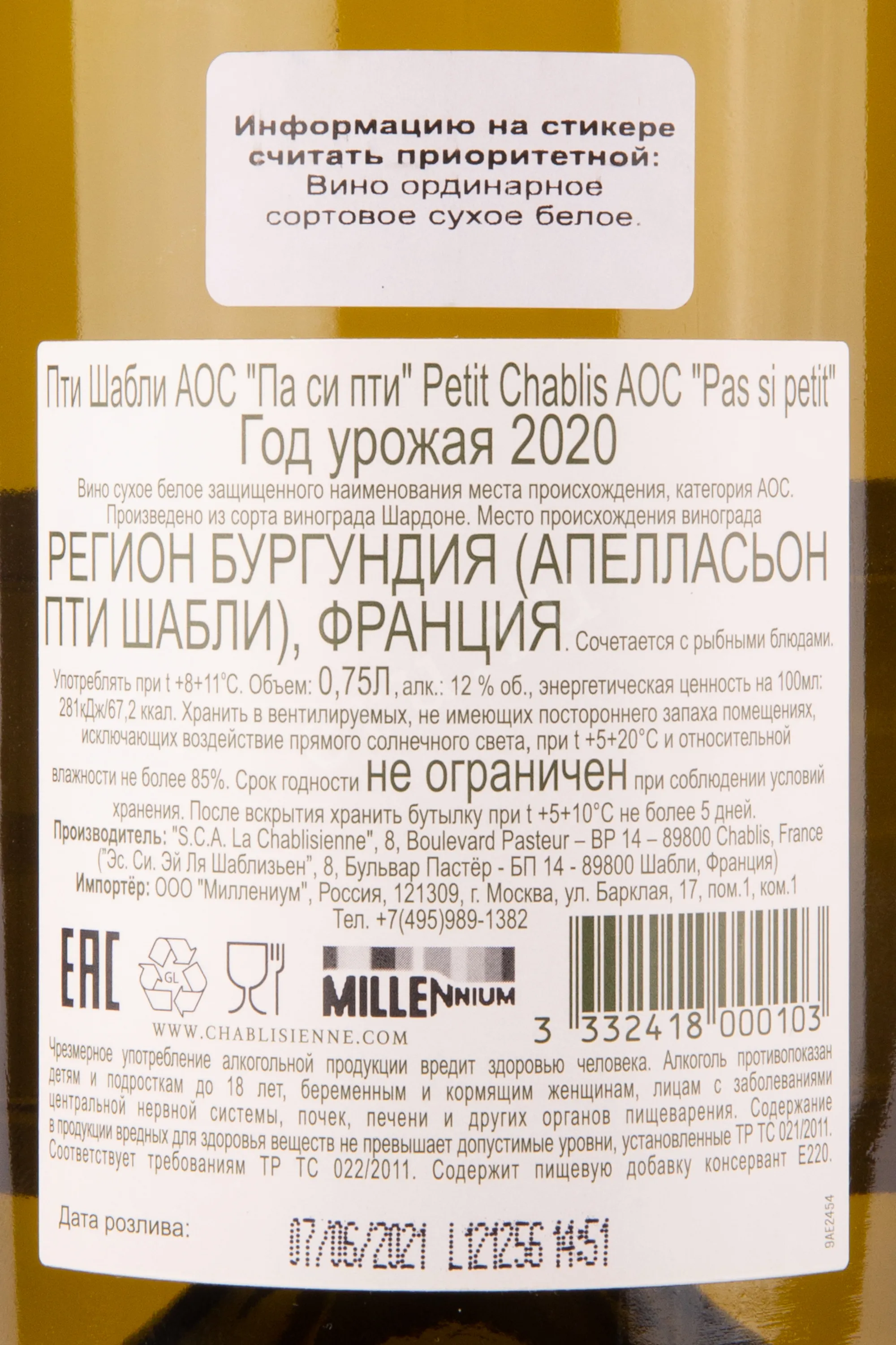 La Chablisienne Petit Chablis Pas si Petit 0.75 л купить - Французское вино Ла Шаблизьен Пти Шабли Па Си Пти цена в магазинег. Москва, ул. Профсоюзная, д. 16/1010:00-22:00 Ежедневно+7 (495) 920-20-02info@cru.ru