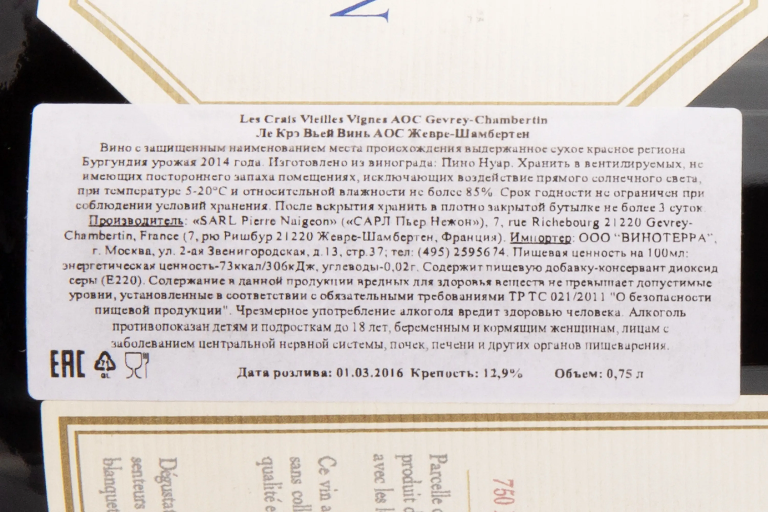 Les Crais Vieilles Vignes Gevrey-Chambertin Pierre Naigeon 2014 0.75 л купить - Французское вино Ле Крэ Вьей Винь Жевре Шамбертен Сарл Пьер Нежон цена в магазинег. Москва, ул. Профсоюзная, д. 16/1010:00-22:00 Ежедневно+7 (495) 920-20-02info@cru.ru