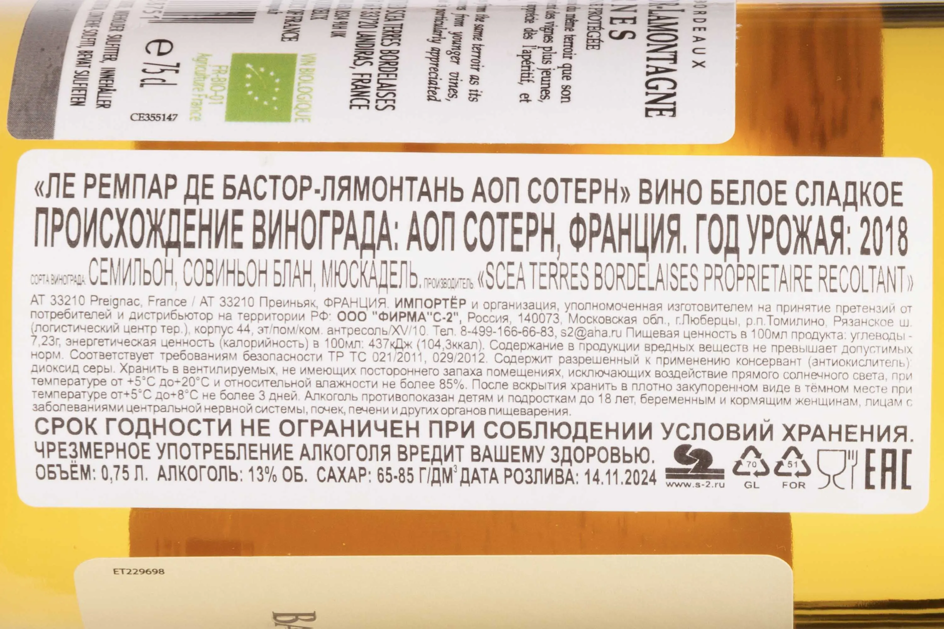 Вино Les Remparts de Bastor-Lamontagne Sauternes AOP 2018 0.75 л рождается на престижных виноградниках Château Bastor-Lamontagne, расположенных на юге Бордо, в апелласьоне Сотерн. Уникальность напитка обеспечивается особым микроклиматом и редким явлением благородной плесени (Botrytis cinerea), поражающей ягоды. Урожай собирается вручную в несколько этапов, чтобы отобрать максимально концентрированный и поражённый плесенью виноград. Брожение и выдержка проходят в дубовых бочках, благодаря чему напиток приобретает сложность, глубину и изысканность оттенков.