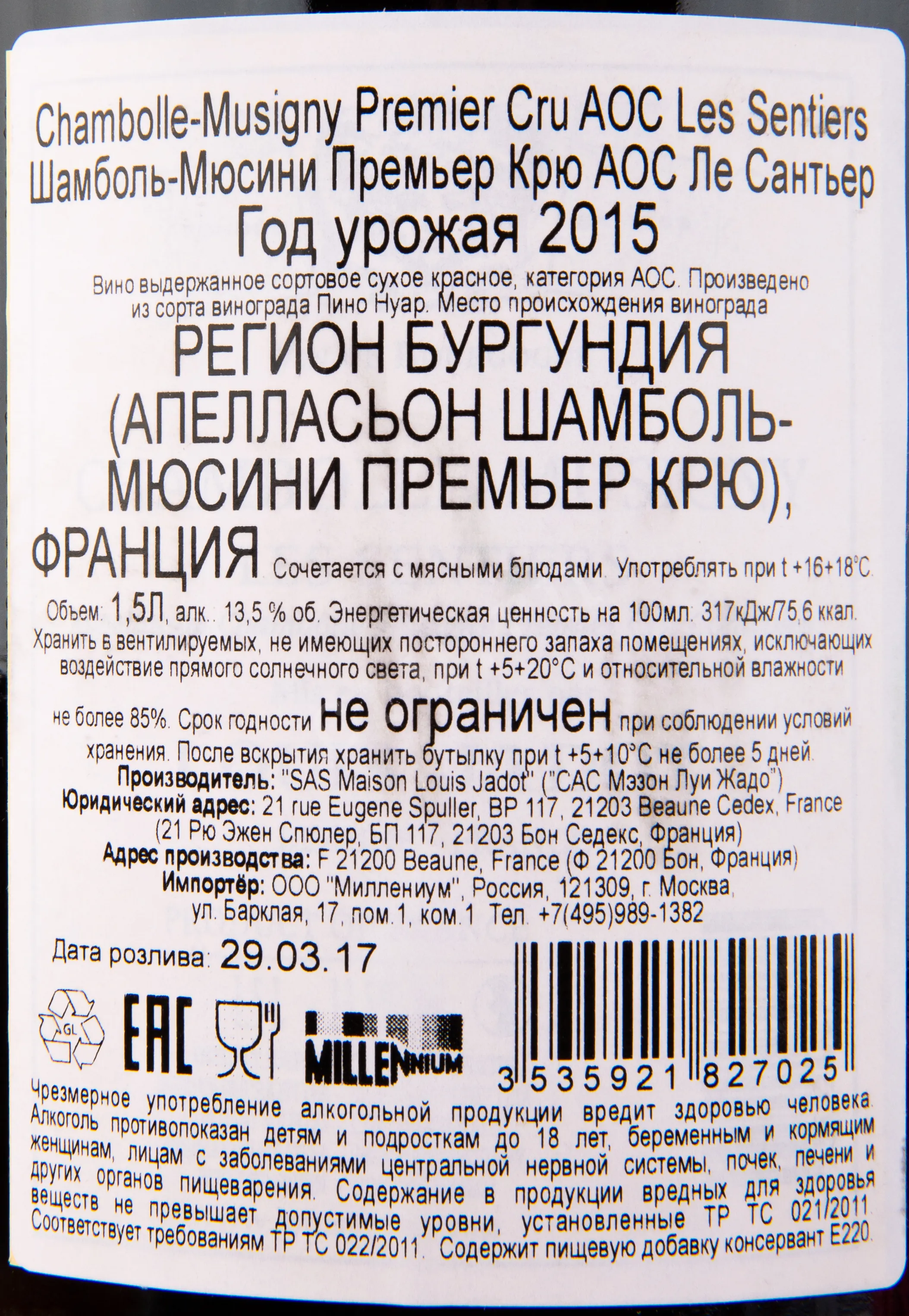 Louis Jadot Chambolle-Musigny Premier Cru Les Sentiers 2015 1.5 л купить - Французское вино Луи Жадо Шамболь-Мюсини Премьер Крю АОС Ле Сантьер цена в магазине г. Москва, ул. Профсоюзная, д. 16/10 10:00-22:00 Ежедневно +7 (495) 920-20-02 info@cru.ru