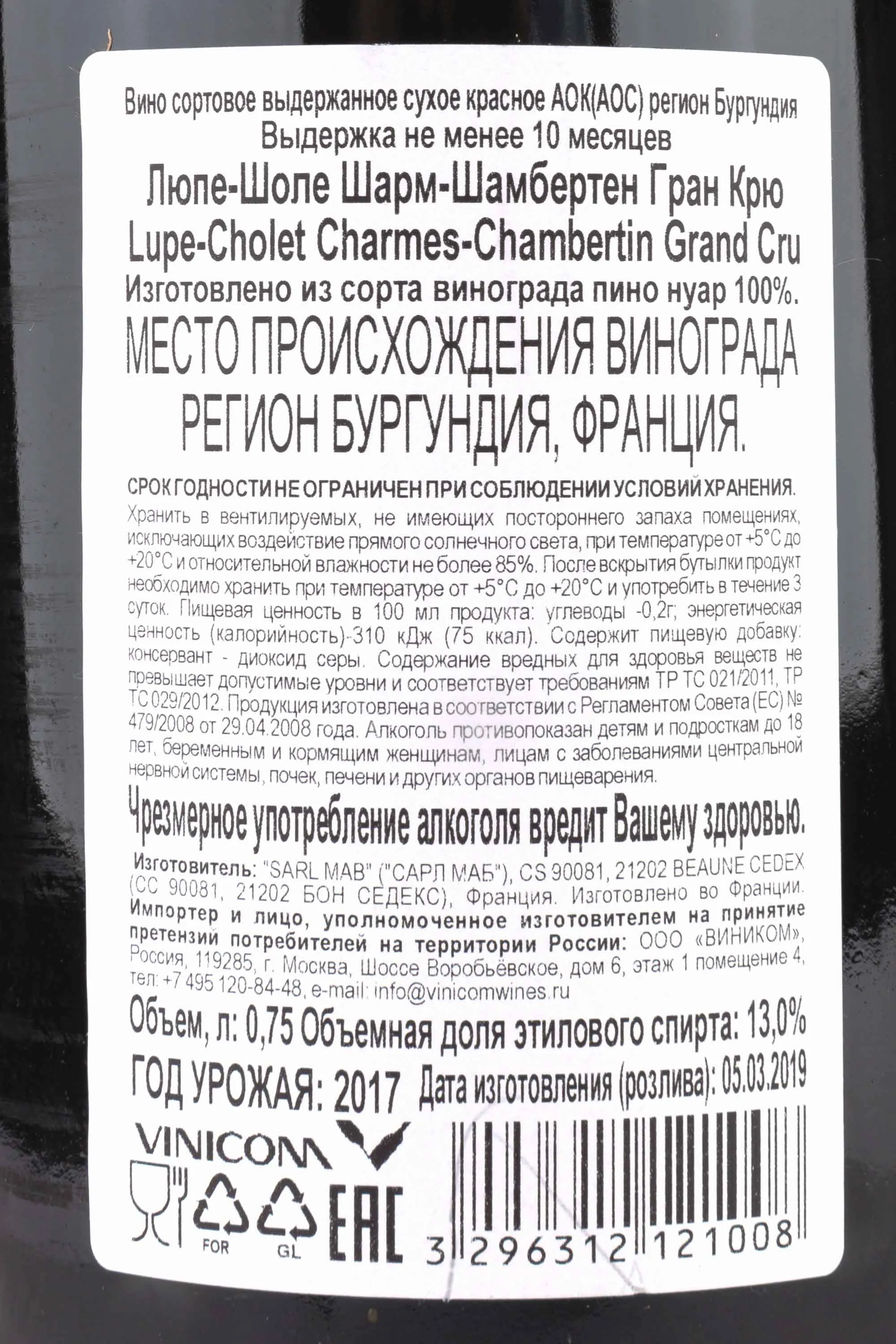 Люпе-Шоле Шарм-Шамбертен Гран Крю 2017 0.75