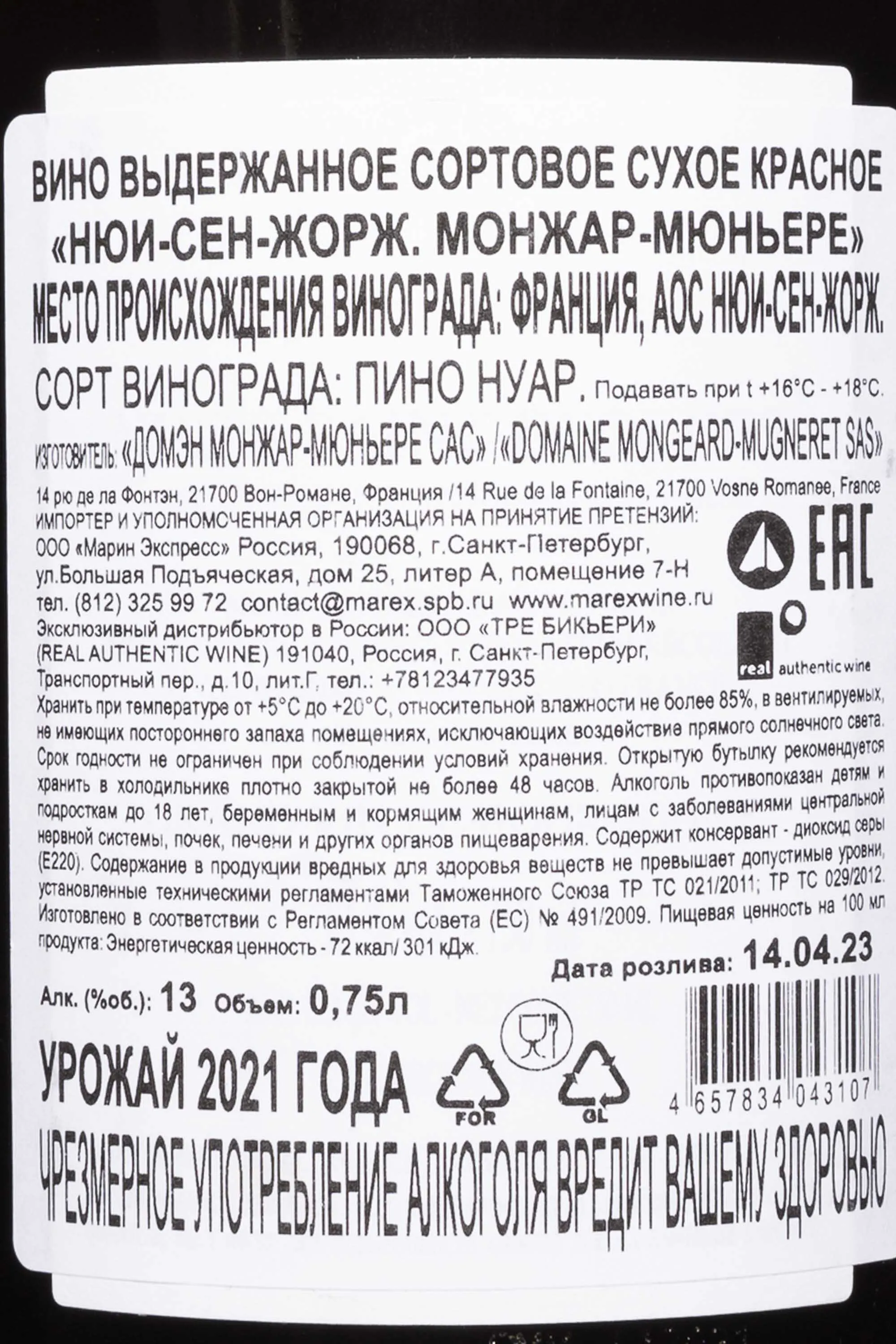 Вино Mongeard-Mugneret Nuits-Saint-Georges AOC 2021 0.75 л родилось в сердце Бургундии, на южных склонах Кот-де-Нюи, где виноградники издавна славились своей мощной и выразительной продукцией. Урожай 21 года собирали вручную, чтобы сохранить целостность ягод и подчеркнуть характер терруара с его известняково-глинистыми почвами и умеренным климатом. Виноделы использовали традиционное брожение в открытых чанах и выдержку в дубовых бочках, что придало напитку сложную структуру, мягкие таннины и гармоничный баланс. Долгое взаимодействие с древесиной позволило спиртному вобрать деликатные пряные оттенки и сохранить утонченную свежесть.