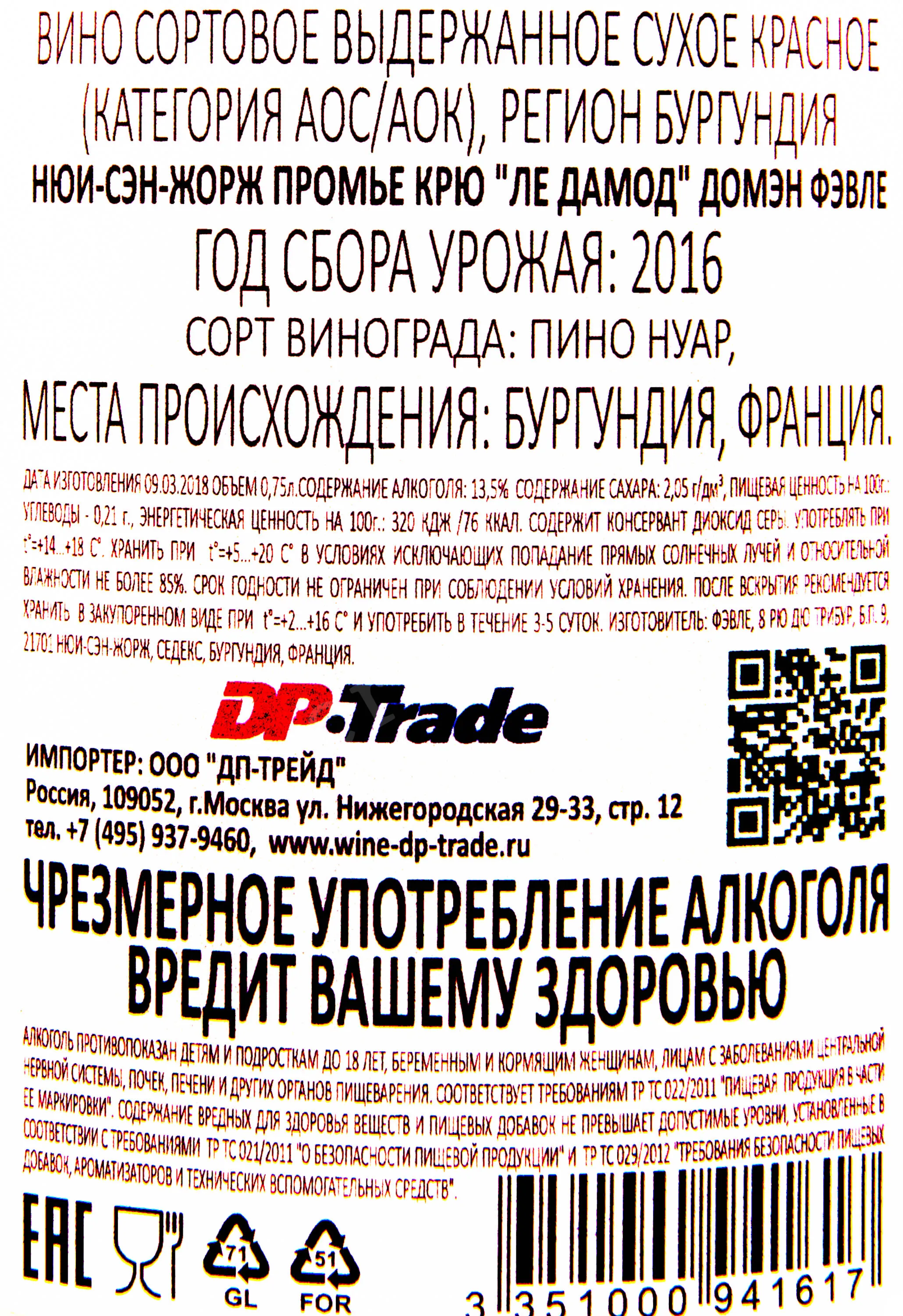 Домен Фэвле Нюи Сен Жорж Премье Крю Ле Дамод 2016 0.75