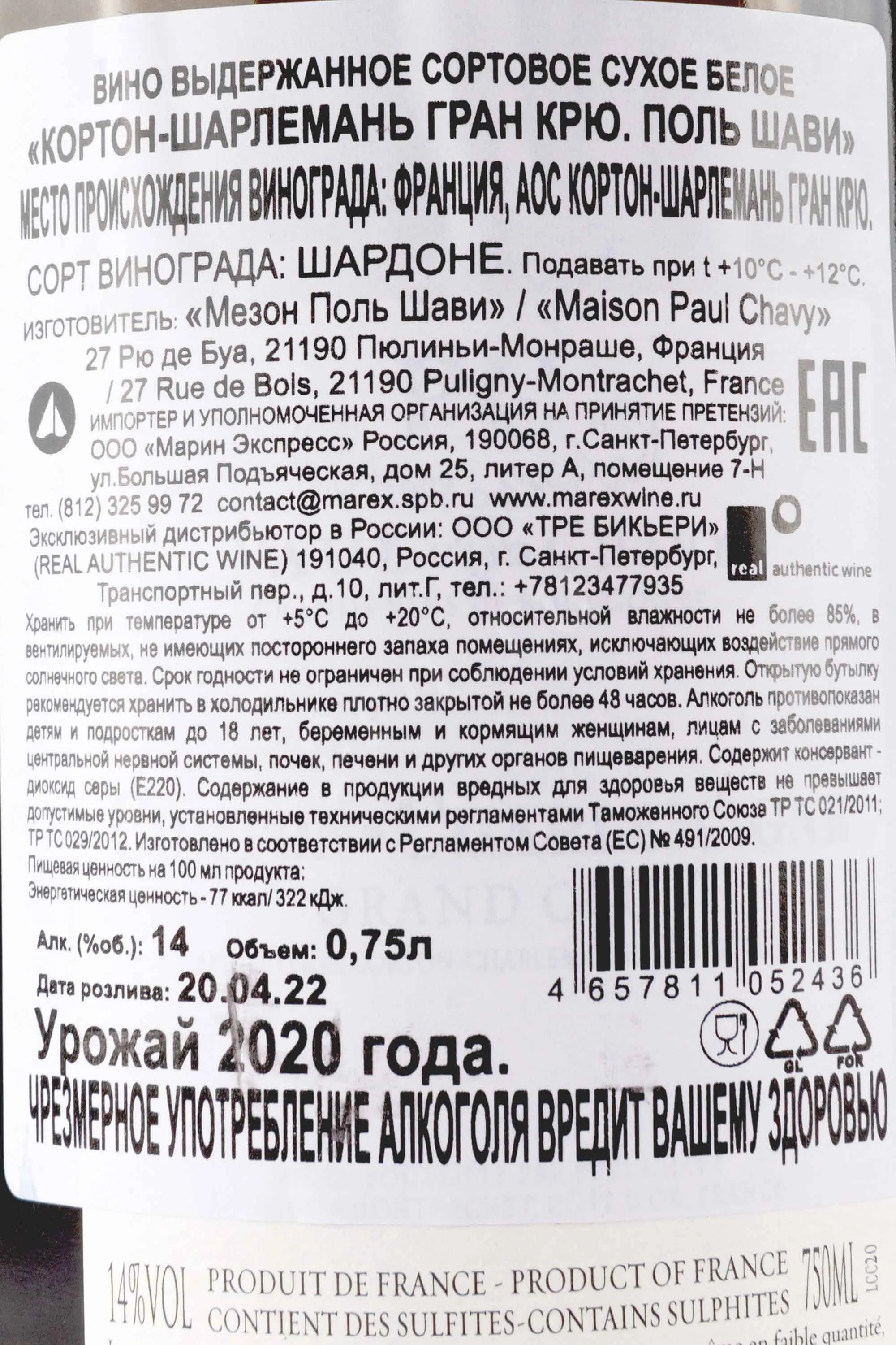 Paul Chavy Corton-Charlemagne Grand Cru 2020 0.75 л купить - Французское вино Поль Шави Кортон-Шарлемань Гран Крю цена в магазинег. Москва, ул. Профсоюзная, д. 16/1010:00-22:00 Ежедневно+7 (495) 920-20-02info@cru.ru