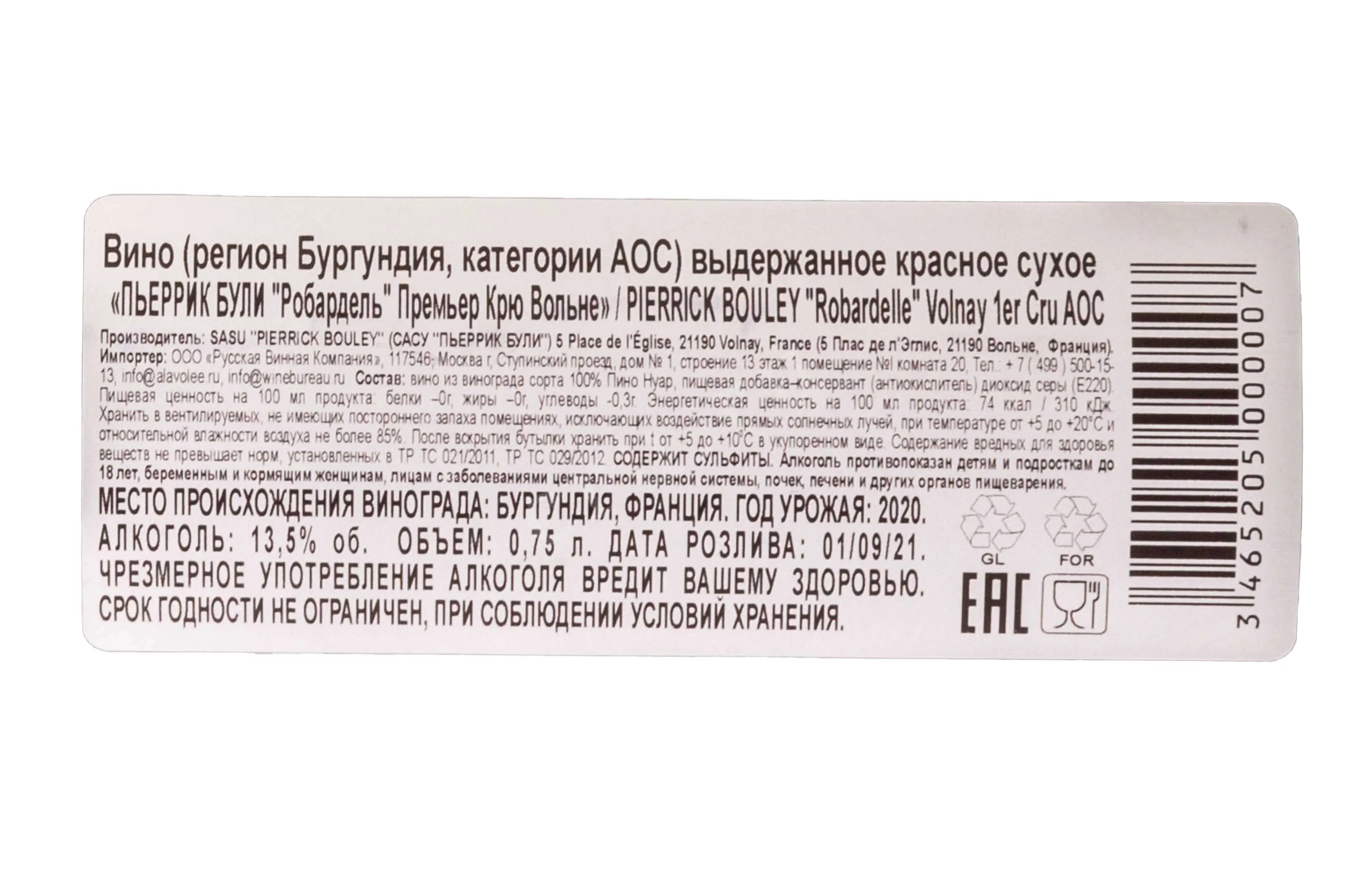 Пьеррик Були Робардел Примьер Крю Вольне 2020 0.75