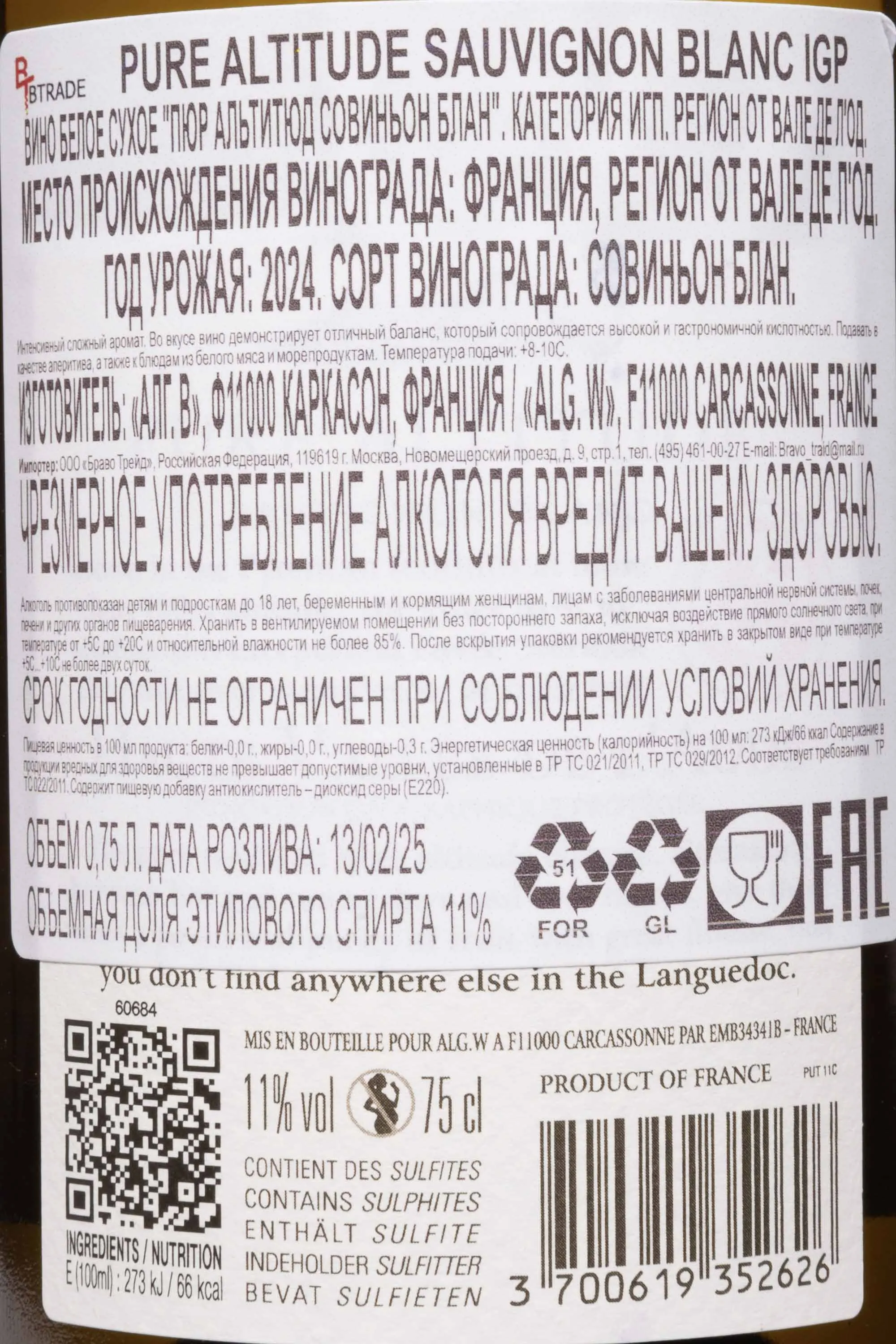 Вино Pure Altitude Sauvignon Blanc IGP 2024 0.75 л изготовлено из винограда, вырощенного в особых климатических условиях региона Haute Vallee de l'Aude, расположенного на высоте более 500 метров над уровнем моря. Благодаря значительному перепаду температур днем и ночью ягоды обретают яркий аромат и сбалансированную кислотность. Для производства используется метод холодной мацерации, при котором виноград выдерживают на кожице при низких температурах, что позволяет сохранить свежесть и насыщенные фруктово-минеральные оттенки во вкусе. Особенности терруара — известняково-глинистые почвы, обогащённые минеральными веществами, — обеспечивают напитку уникальную утонченность и выразительный характер.