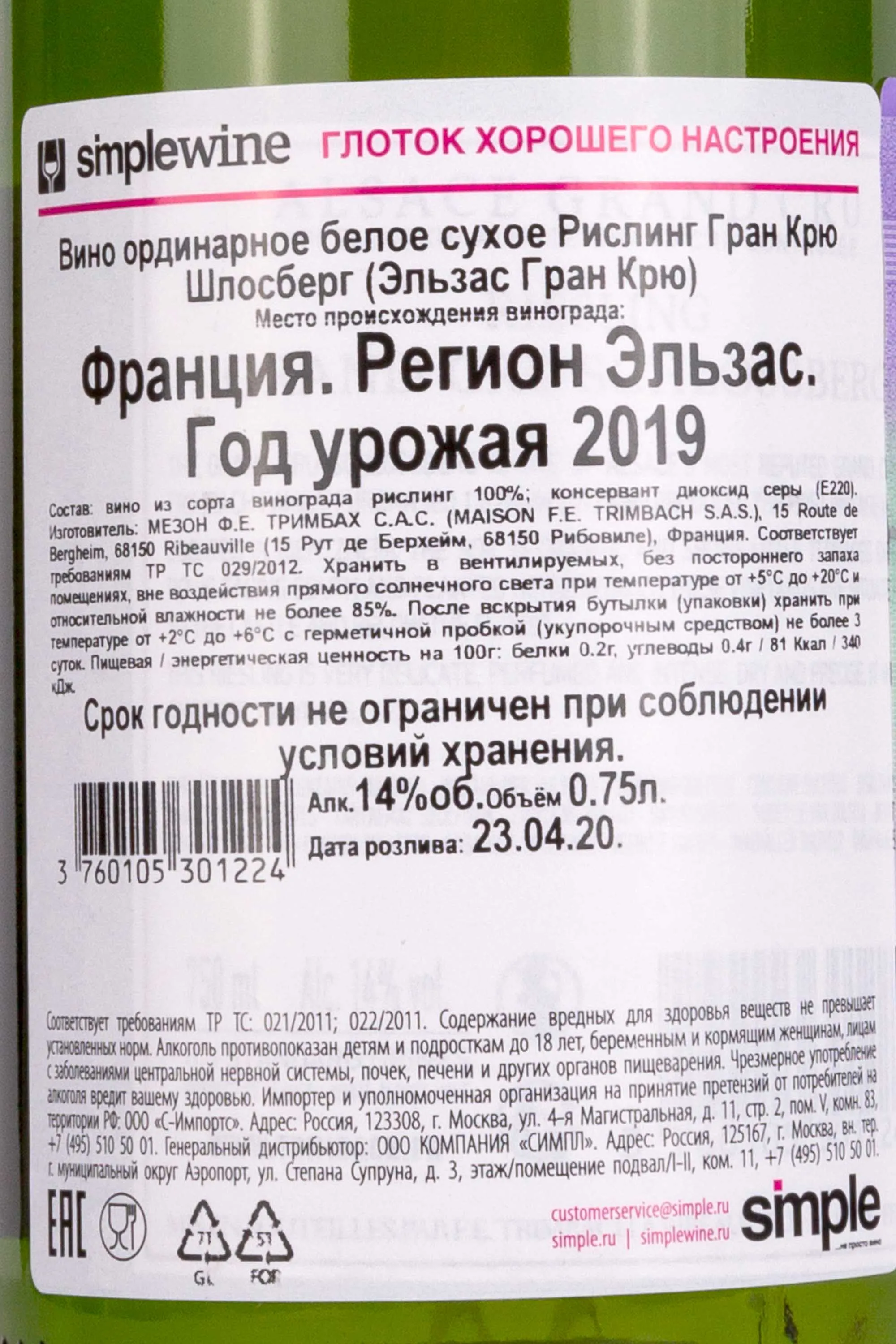 Тримбах Рислинг Гран Крю Шлосберг 2019 0.75