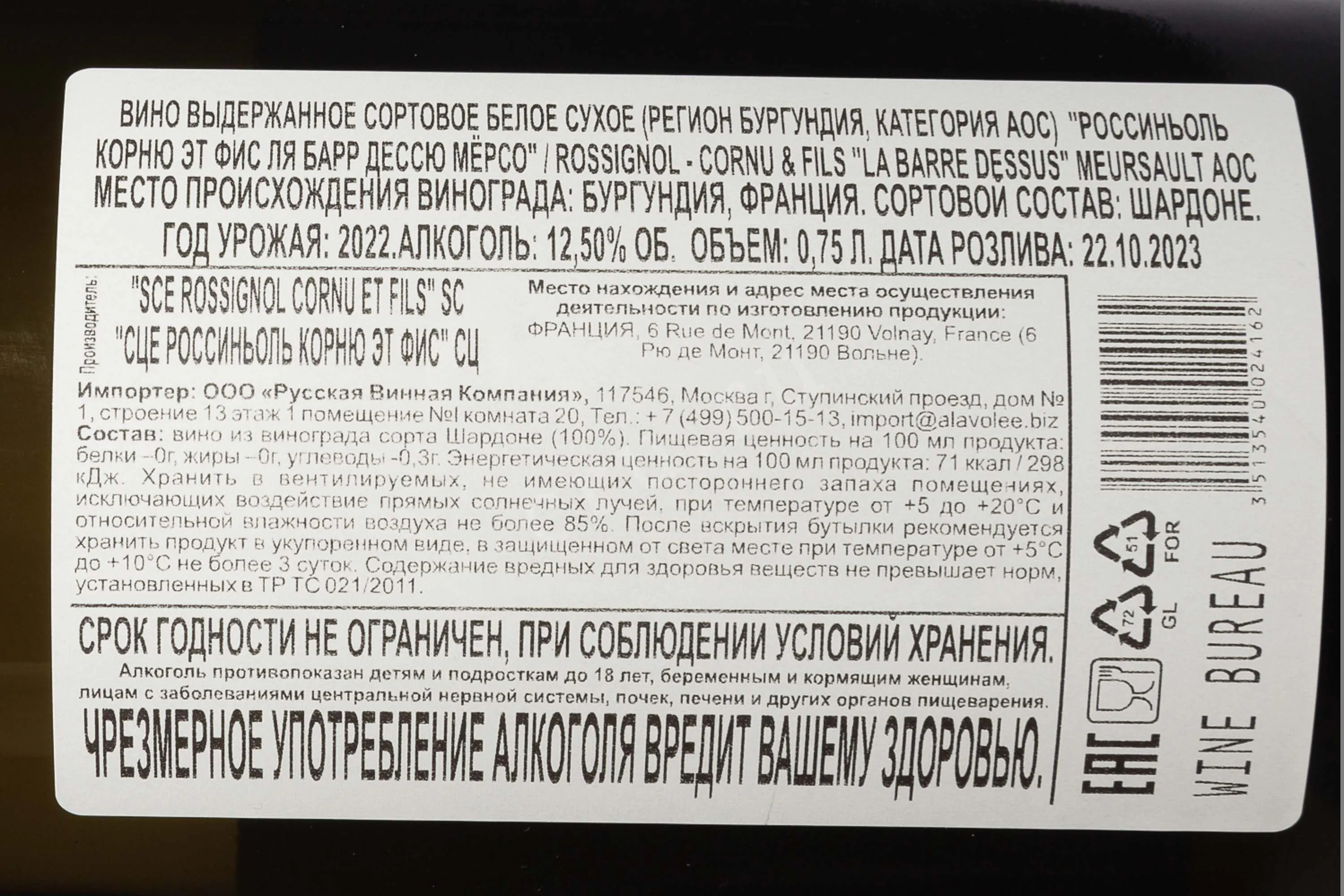 Белое сухое вино Rossignol Cornu et Fils La Barre Dessus Meursault AOC 2022 г. 0,75 л создано на известняково-глинистых почвах северной части Мерсо, где участок Ля Барр Дессю формирует структурный минеральный стиль. Урожай собирали вручную. В погребе ягоды размяли перед прессованием, а муст выдержали 24 часа в стальном резервуаре для осветления и охлаждения. Алкогольная и малолактическая ферментация проходила в дубовых бочках. При необходимости проводили батонаж, чтобы придать напитку дополнительную глубину. Кюве созревало пополам в новых бочках и ёмкостях повторного наполнения. После 9 месяцев в дубе партии объединили и дали отдохнуть еще 90 дней в стальных резервуарах.
