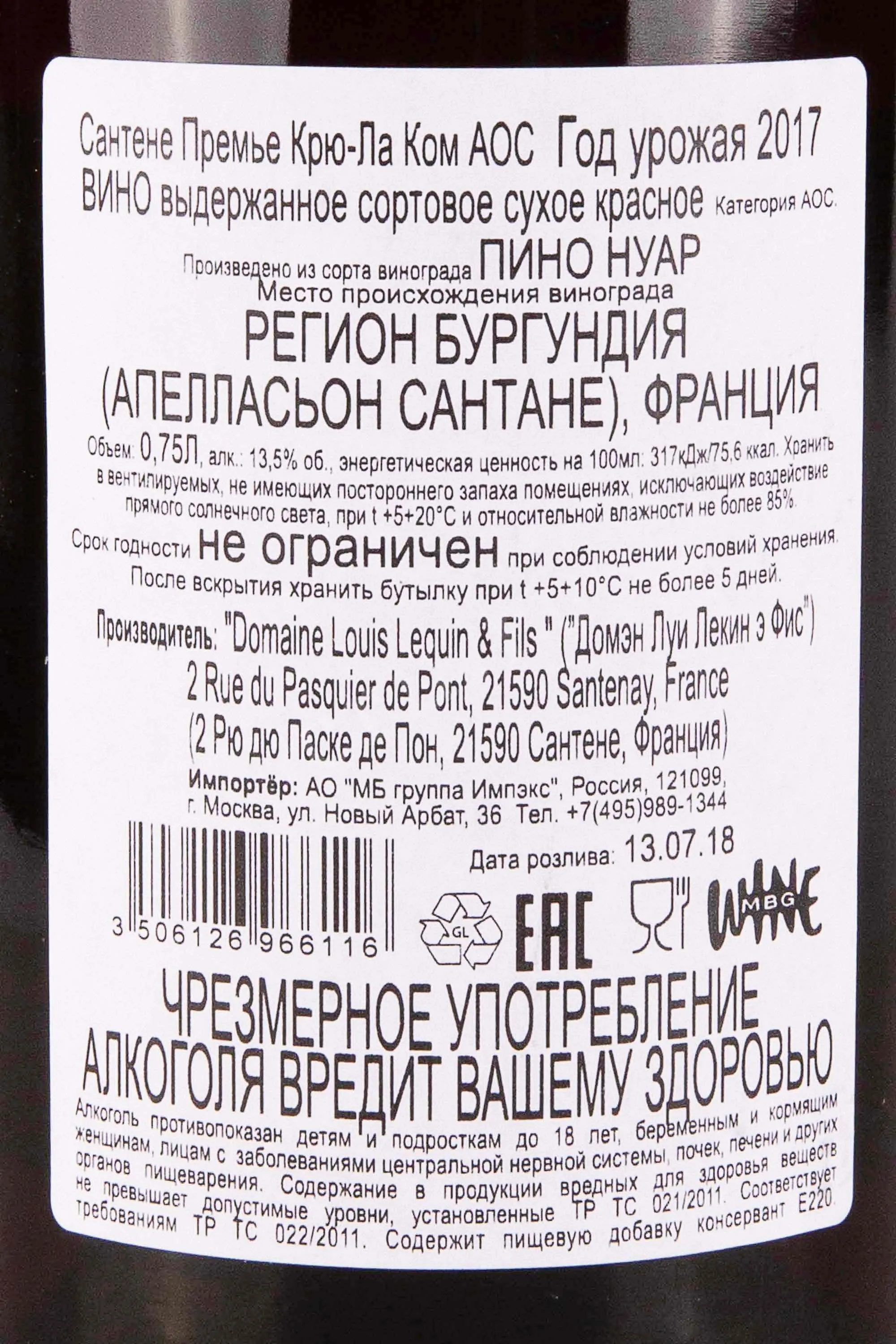 Santenay Premier Cru La Comme Domaine Louis Lequin et Fils 0.75 л купить - Французское вино Сантене Премье Крю-Ла Ком Домэн Луи Лекин э Фис цена в магазине г. Москва, ул. Профсоюзная, д. 16/10 10:00-22:00 Ежедневно +7 (495) 920-20-02 info@cru.ru