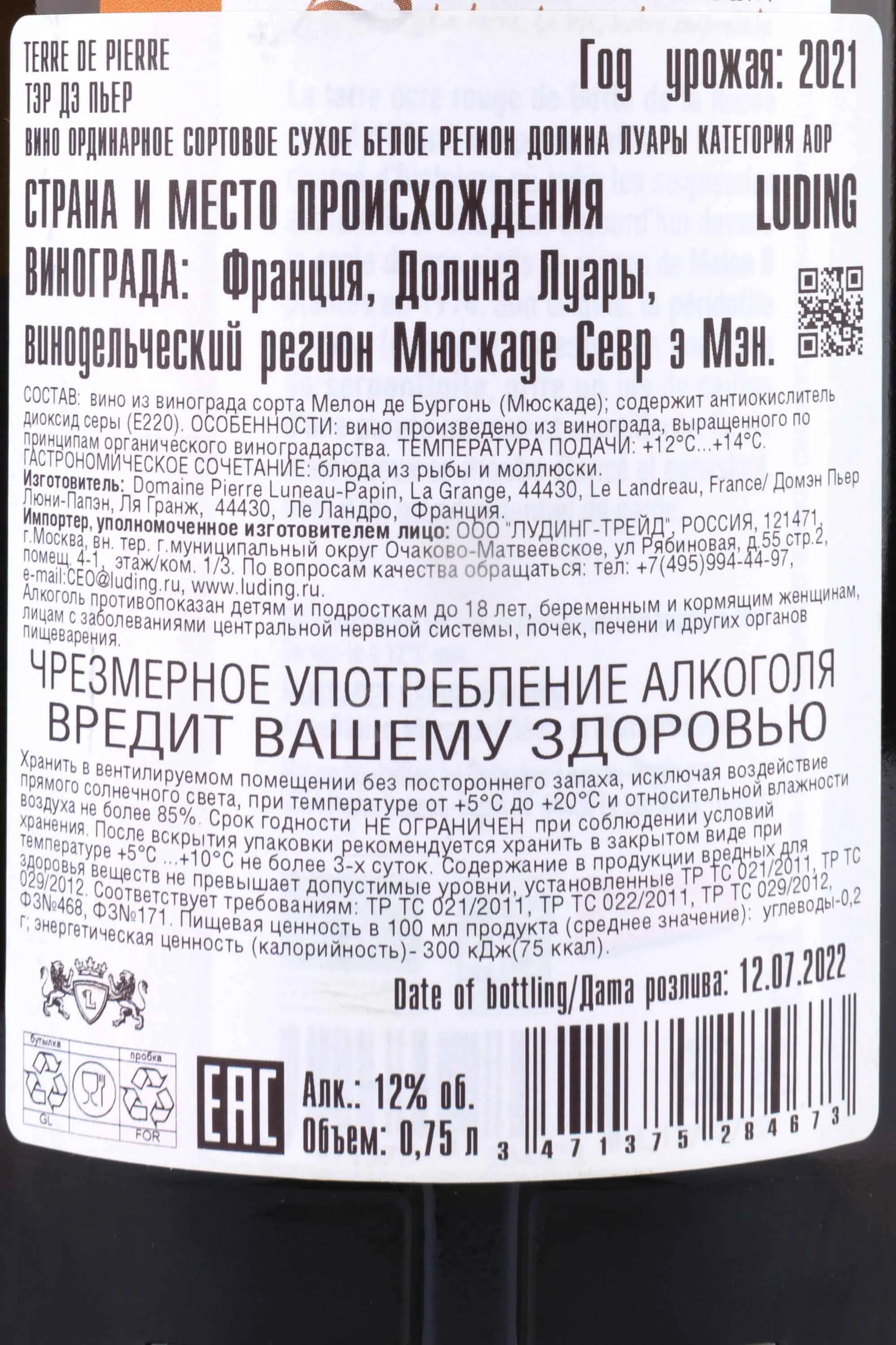 Terre de Pierre Muscadet Sevre et Maine Sur Lie 0.75 л купить - Французское вино Тэр дэ Пьер АОС Мюскаде Севр э Мен цена в магазинег. Москва, ул. Профсоюзная, д. 16/1010:00-22:00 Ежедневно+7 (495) 920-20-02info@cru.ru