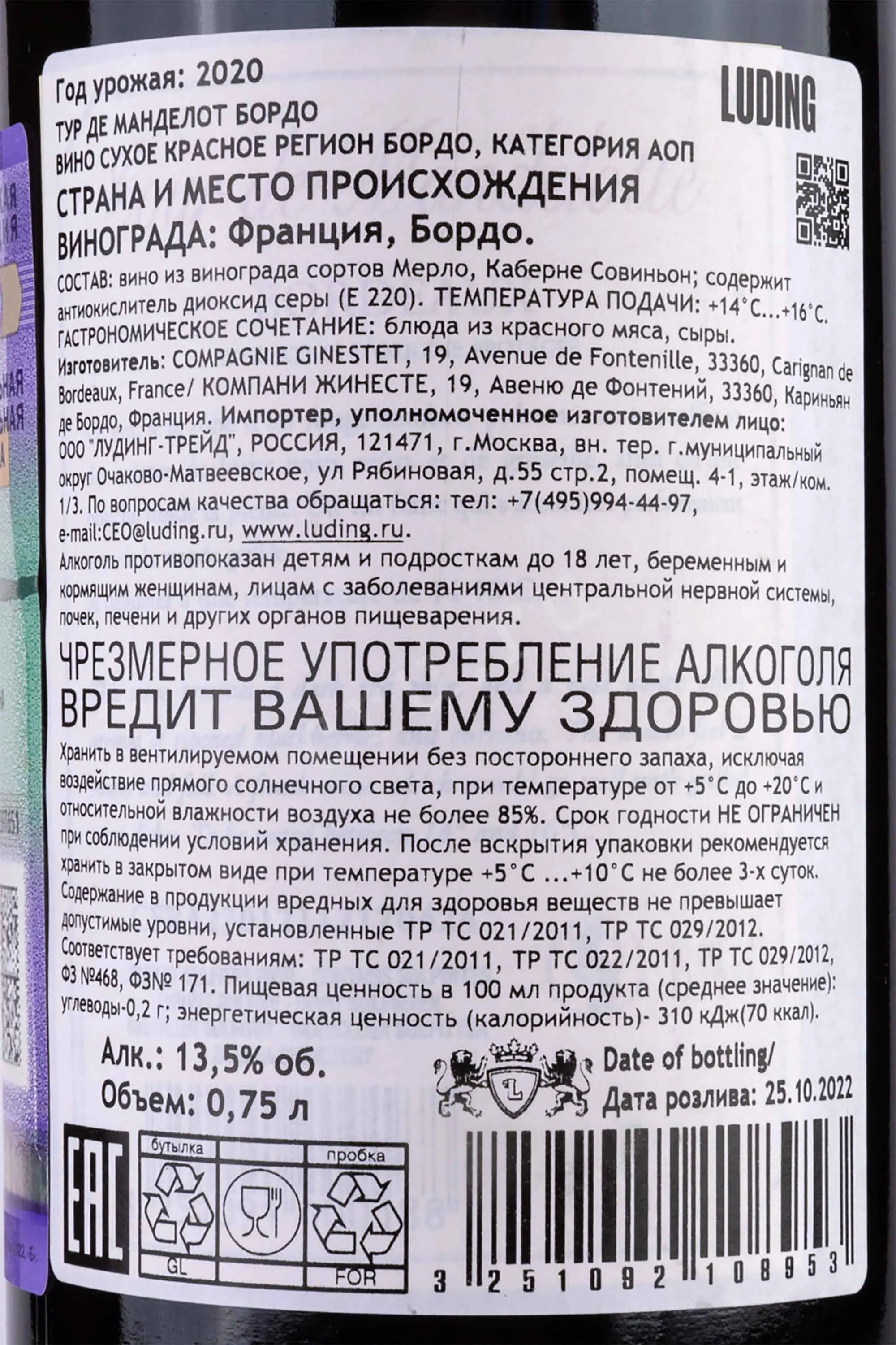 Tour de Mandelotte Bordeaux red 0.75 л купить - Французское вино Тур де Манделот Бордо красное цена в магазине г. Москва, ул. Профсоюзная, д. 16/10 10:00-22:00 Ежедневно +7 (495) 920-20-02 info@cru.ru