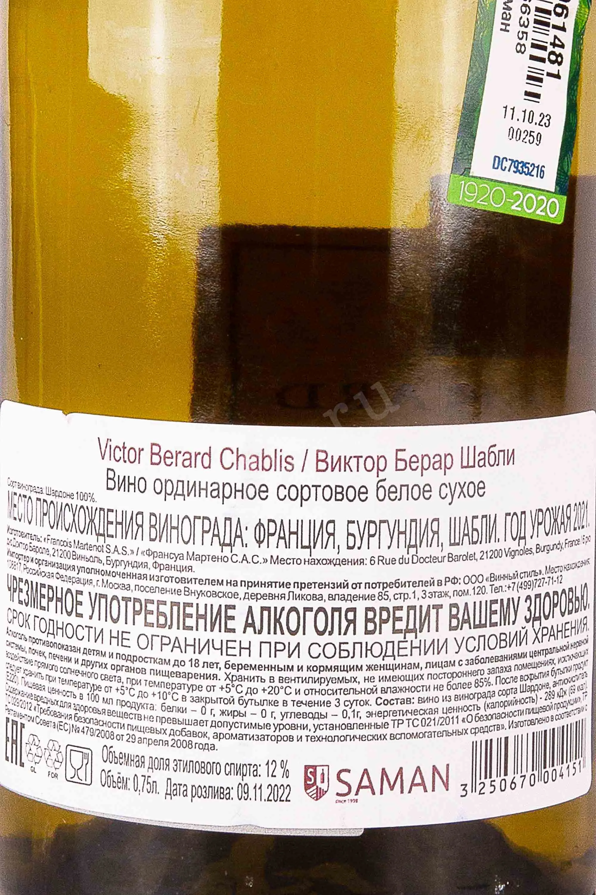 Victor Berard Chablis 0.75 л купить - Французское вино Виктор Берар Шабли цена в магазине г. Москва, ул. Профсоюзная, д. 16/10 10:00-22:00 Ежедневно +7 (495) 920-20-02 info@cru.ru