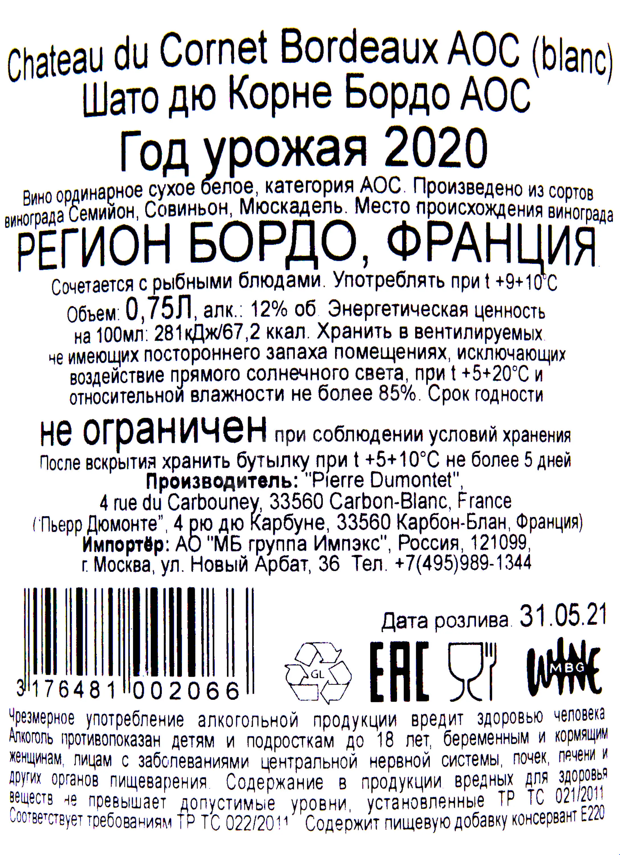 Шато дю Корне Бордо АОС Пьерр Дюмонте белое 2020 0.75