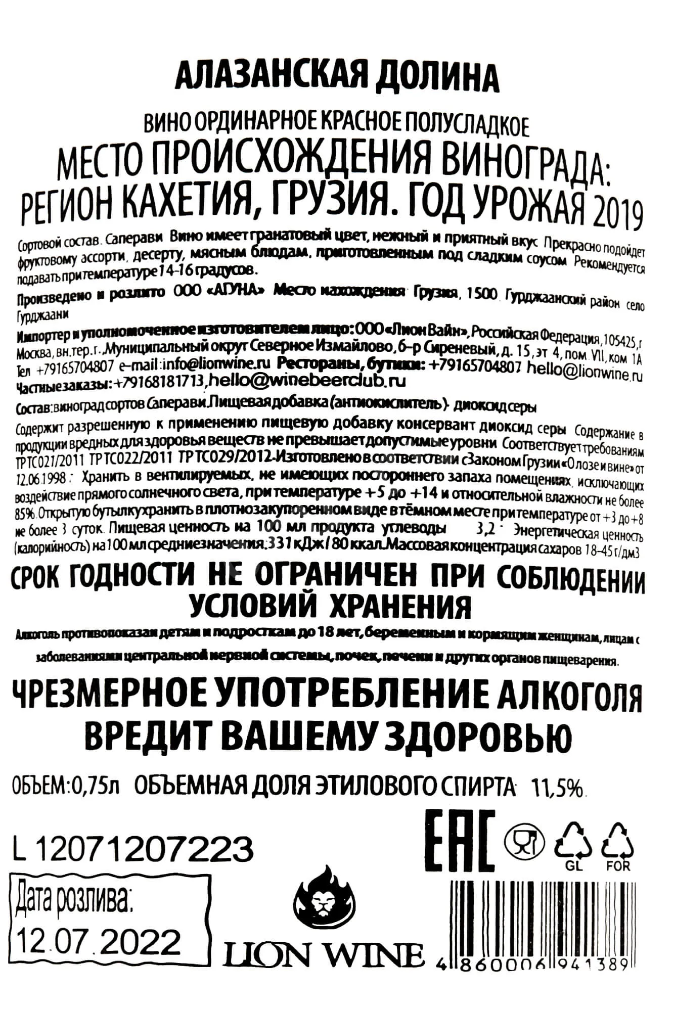 Вино Агуна Алазанская Долина красное полусладкое 0,75 л создается по классическим грузинским традициям с использованием натуральных дрожжей и контролем температуры брожения, что позволяет сохранить яркость ягодных оттенков и естественную сладость. Урожай собирают вручную на солнечных склонах Алазанской долины, где мягкий климат и плодородные аллювиальные почвы способствуют равномерному созреванию ягод. Поздний сбор обеспечивает концентрированный вкус и насыщенный аромат. После ферментации напиток выдерживается в нержавеющих резервуарах, что сохраняет чистоту фруктовых тонов и характерную свежесть. Этот напиток отражает уникальность терруара Кахетии — региона, где соединяются древние винодельческие традиции и современное мастерство.