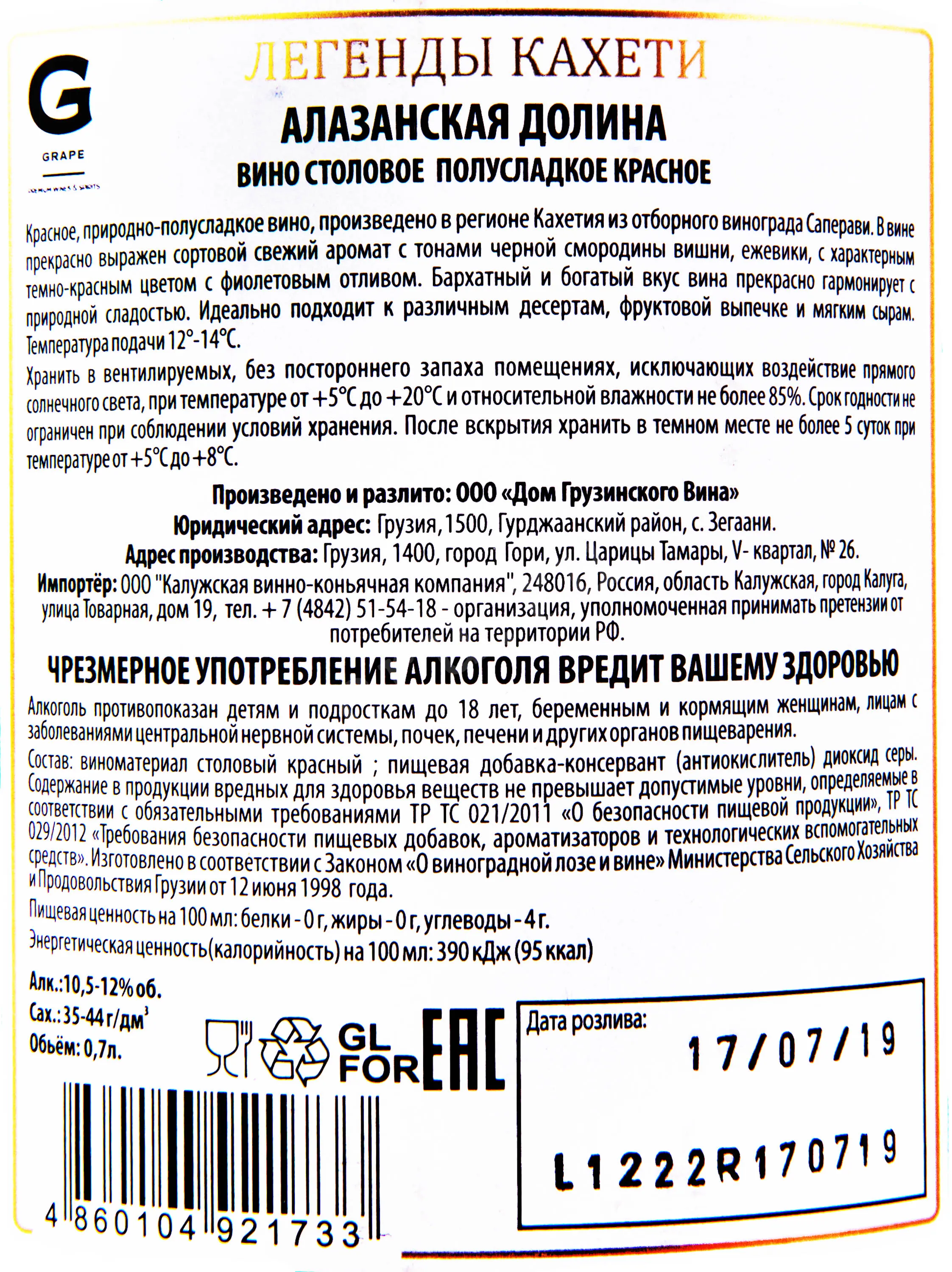 Вино Легенда Кахетии Алазанская Долина 0,75 л создаётся в сердце Кахетии — регионе, где мягкий климат, щедрое солнце и плодородные аллювиальные почвы долины реки Алазани формируют благородный характер напитков. Винодельня «Легенда Кахетии» придерживается традиционной грузинской технологии: ягоды сорта Саперави позднего сбора проходят бережное дробление и ферментацию при контролируемой температуре, что позволяет сохранить естественную сладость и фруктовую насыщенность. Мацерация на кожице усиливает цвет и глубину вкуса, а выдержка в резервуарах из нержавеющей стали стабилизирует структуру и баланс сахаров. Этот напиток воплощает характер Грузии — щедрый, тёплый, с выразительным ароматом и мягким, обволакивающим вкусом.