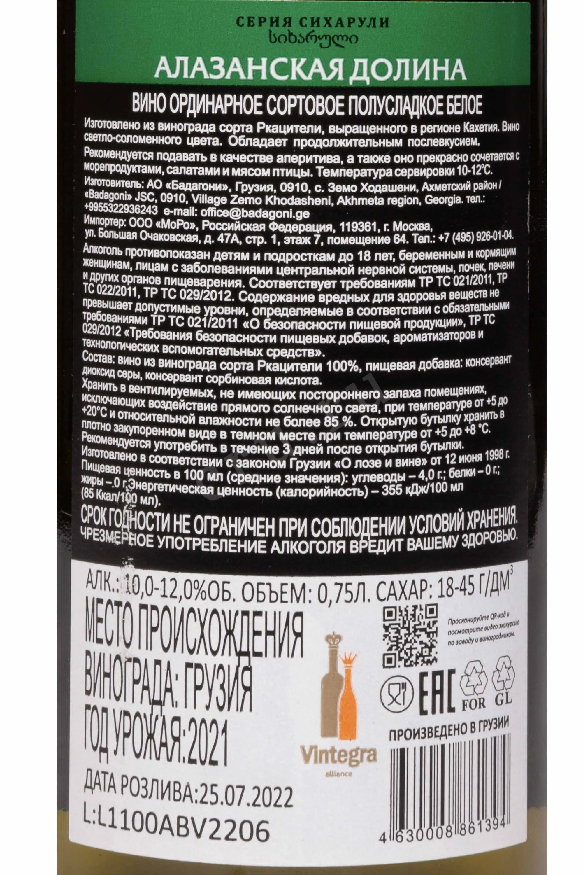 Белое полусладкое вино Alazani Valley White Sikharuli 2021 года 0.75 л — лёгкое и ароматное, с ярко выраженным фруктовым характером. Производится в Алазанской долине — одном из самых тёплых регионов Кахетии. Благодаря мягкому климату и плодородной почве, виноград здесь достигает оптимальной зрелости, что придаёт вину насыщенный вкус. Ферментация проходит при контролируемой температуре в стальных емкостях, что сохраняет свежесть и натуральные ароматы ягод. Выдержка минимальная, что дает возможность подчеркнуть яркость и молодость этого вина.